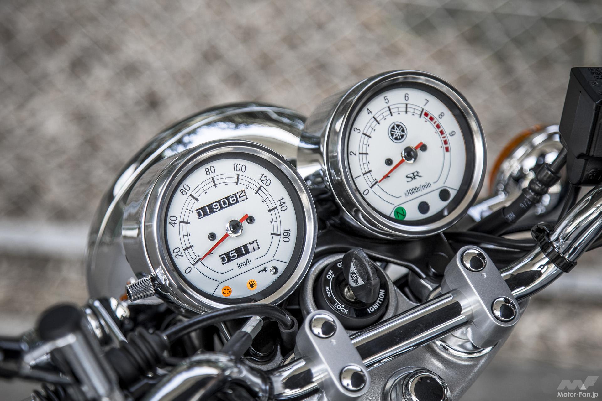 ズドドドっでも、ドバババっでもなく、それより軽めのシュタタタといった感じの鼓動感で回転を上げて行くと、トップギヤ5速の2500rpm付近でメーター読みは60km/h。この付近から上でエンジンは元気にレスポンスし、スロットルの開け閉めが楽しくなる。加えて、回転の立ち上がり方もFI化以降で鋭く明瞭になった印象があり、キャブレター時代より雑味の少ない鼓動が感じられる。そしてトップギヤ5速3600rpmで80km/h、4700rpmで100km/hと速度を上げるものの、乗り手側は自然と3000〜4000rpmの間で回転を上げ下げしつつ走っているのも、以前からのSRのままだ。速度にすれば60〜90km/hくらいの領域だろうか、SRはこの範囲で高めのギヤを使いスロットルを開け閉めしてワインディングを流したり、たんたんと走り続けるのが楽しい。