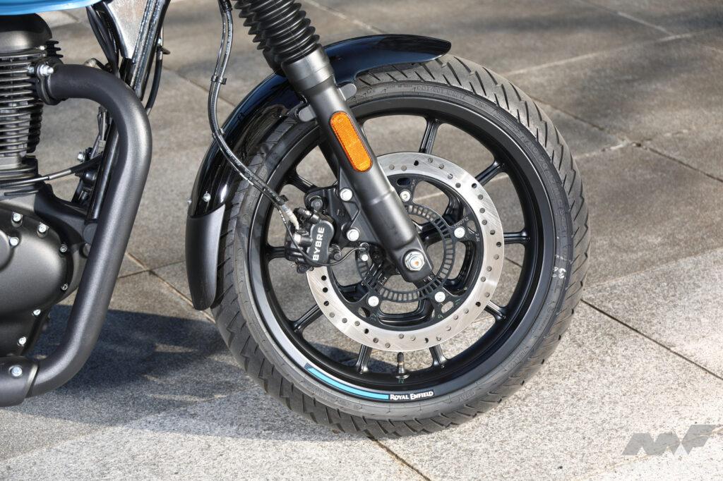 ゴムブーツでカバーされたフロントフォークはφ41mmサイズの正立式で130mmのストロークを持っている。5点支持されたφ300mmのディスクローターにはBYBRE製2ピストンのピンスライド式キャリパーを装備。