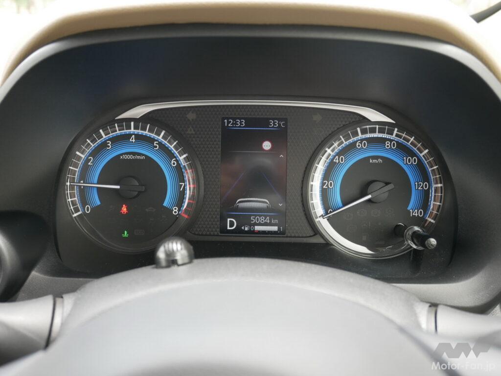 またメーターに表示されるバッテリー充電率と航続可能距離については、出発時が150km/94%で、1時間の試乗を終えた段階では104km/73%となっていました(エアコンオフでの数字)。だいたい充電率1%が1.4~1.5km走行の目安になるという表示です。カタログスペックではWLTCモード180kmの一充電航続距離となっていますが、実際の数値に近い数字を辛めに表示しているといえます。