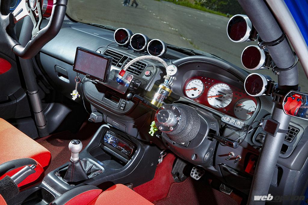 デフィの追加メーターが乱舞するド派手なインテリア。メインメーターはレアな無限のフルスケールを奢る。ちなみにステアリングは脱着式だが、サーキット走行時とストリート時で違う銘柄を使い分けているそうだ。