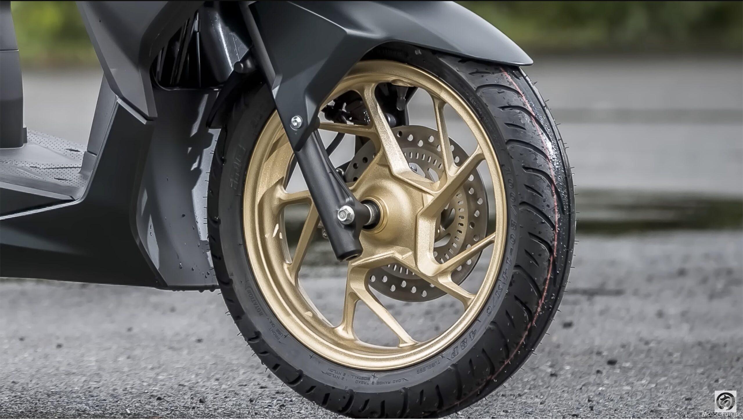 ホイールは前後14インチでフロント100/80、リヤ120/70サイズのタイヤを履いている。PCXはリヤが13インチで前後ともひと回り太いタイヤサイズなので、クリック160はヒラリヒラリと軽快感あるハンドリングと直進安定性に優れることが想像できる。またブレーキは前後ディスクでフロントにのみABSが作用する。もちろん前後連動なので、リヤを強めにかけてロックさせても唐突さがないのが特徴だ。