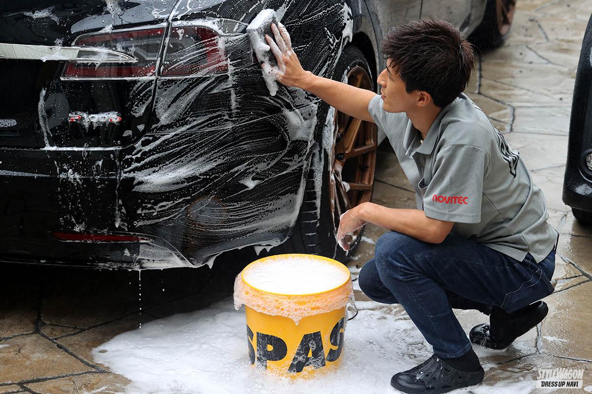 きめ細かな泡立ちで抜群の洗浄力を発揮。通常のカーシャンプーと同様に、ボディを洗ったら水でしっかりと洗い流す。