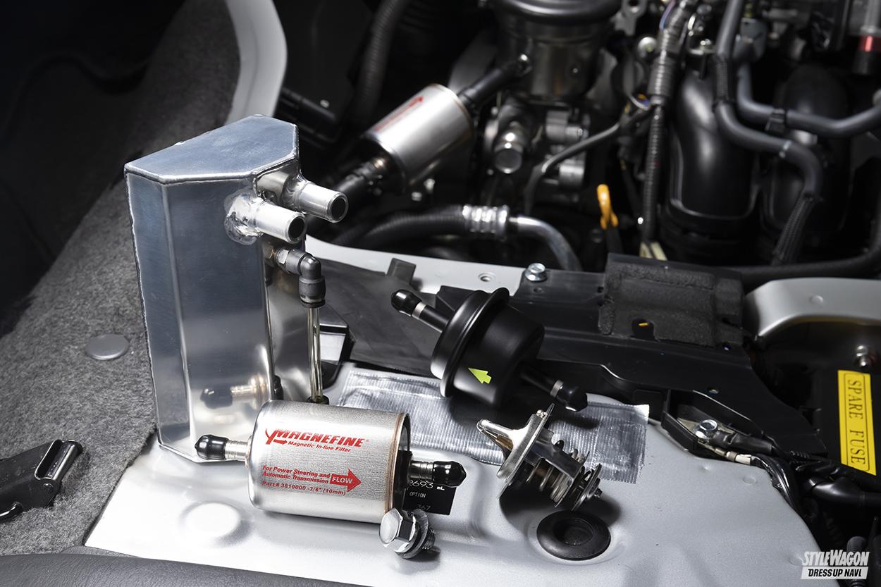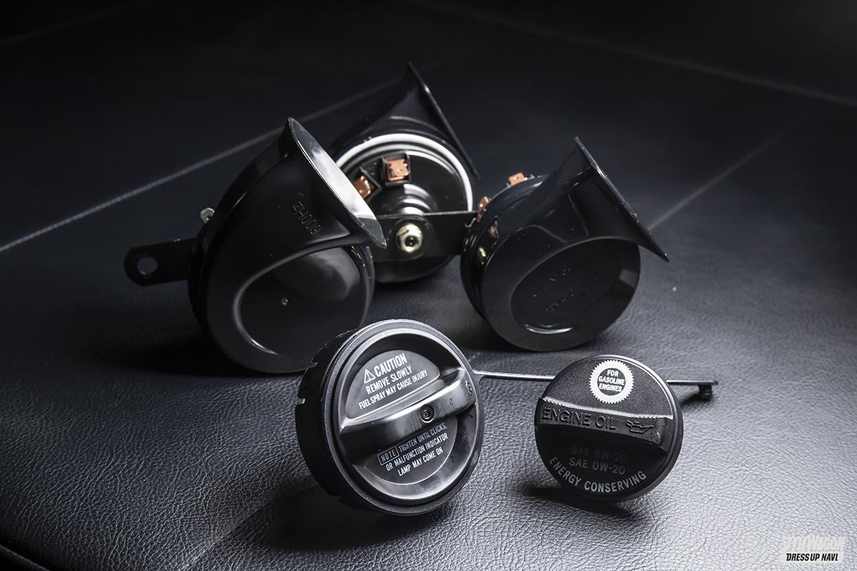 チェックマンといえば理想のハンドリングを引き出すために別タンク式ダンパーをプロデュースするなど、フットワークスペシャリストとしてのイメージが強い。しかし、ラインアップされているオリジナルパーツはリアの快適性を純正シート流用でリーズナブルに引き上げるセカンドシートエクスチェンジレール、3つの音色を重ねて奥行き感のあるクラクションを実現するスリーコードホーン、飛び石などからボンネットを守るフードガードなど、バリエーション豊かだ。