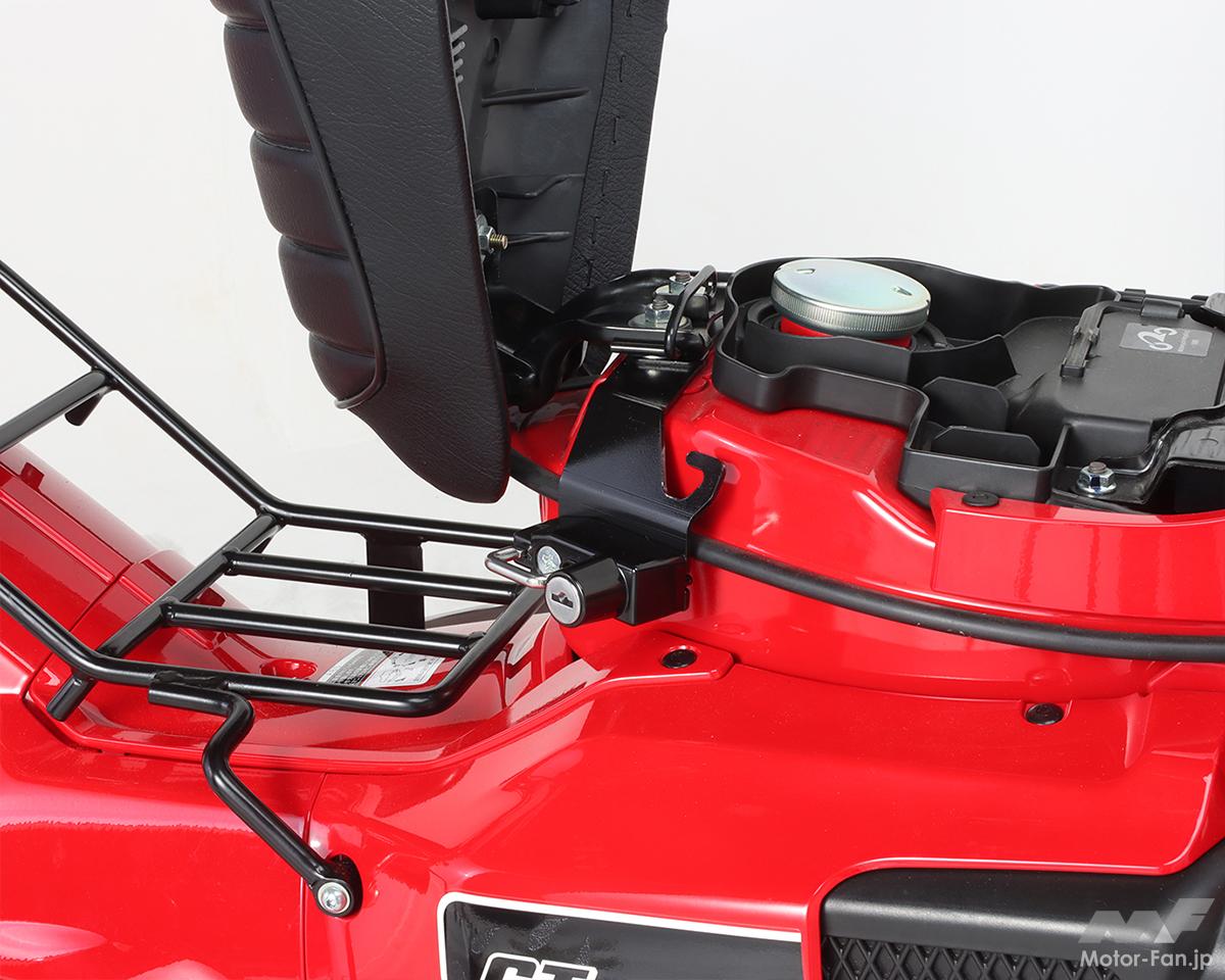飛び石等からエンジン下部をガードする、実用性とドレスアップ性を兼ね備えたスキッドプレート。スキッドプレートを装着したままオイル交換が可能な、メンテナンスリッドを装備。