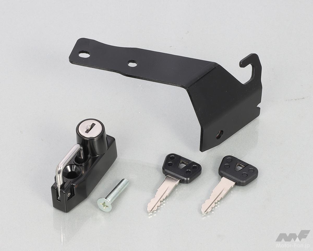ツーリングや出先の休憩など、短時間ヘルメットを掛けておくのに便利なヘルメットロック。シートヒンジ部共締めタイプ。