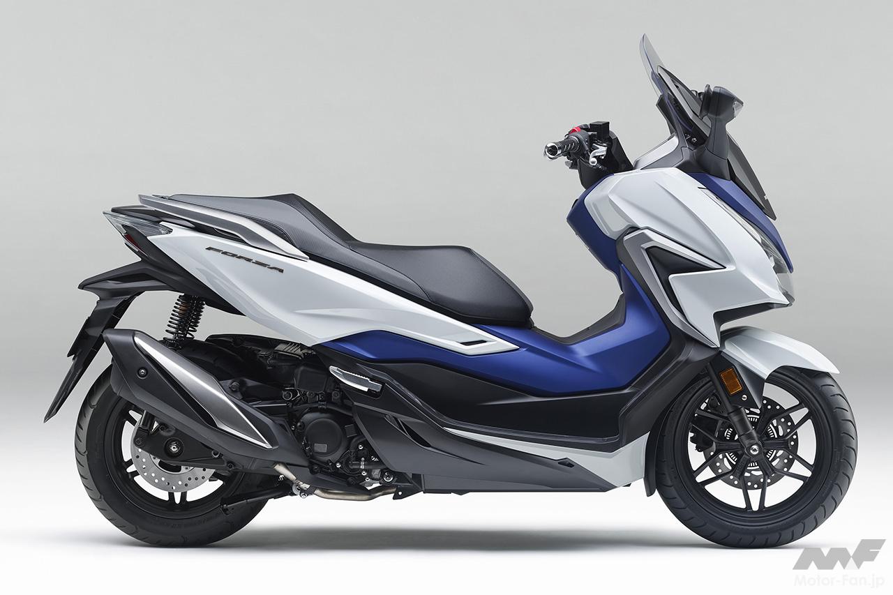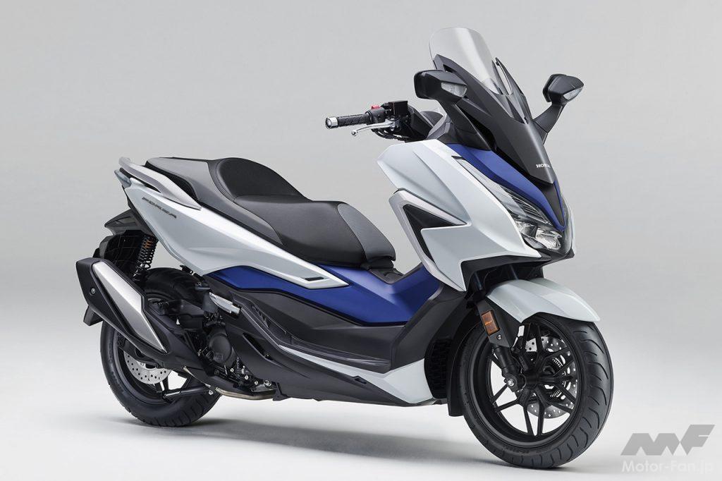 かつてはヤマハ・マジェスティと共に250cc本格派スクーターの人気を牽引したホンダ・フォルツァ。エンジンは水冷4ストロークOHC 4バルブ単気筒249cc。余分な贅肉を削ぎ落した、上記のオフロードモデルとは異なり、マッチョなイメージのカバー類を各部に装着しているため、車両重量が増しているのが特徴。