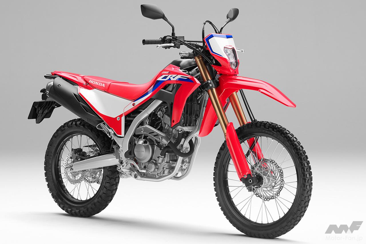 2021年にフルモデルチェンジを実施したホンダのオフロードモデル。力強さと扱いやすさを両立させたエンジンは、水冷4ストロークDOHC単気筒249cc。新設計したエアクリーナーボックス、エキゾーストパイプ&マフラーの採用と、点火時期の最適化により、低回転域からリニアに力強く反応する、コントローラブルなエンジン特性を実現。また、バルブタイミングを変更することで、低中回転域での出力&トルク向上を図っている。