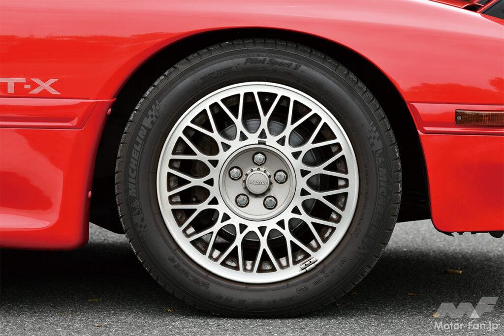 サーキットを走るけれどチューニングはしたくない。とはいえすでに純正部品がないマフラーやショックは社外品にするしかなく、若干車高は下がった。足元に履く純正ホイールは後期の16インチに変更してある。そのせいもあるだろう、現在の走行距離は17万キロを超えたが、13Bエンジンは壊れる気配もないとか。