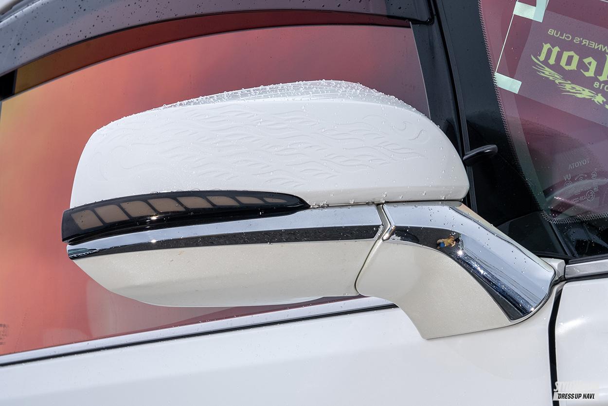 足まわりをカスタムショップのBACK GROUNDに手がけてもらっている以外は、ボディの加工からペイントまでオーナー自ら手がけるDIYの権化のような杉澤号。もとより白が好きとのことでコンセプトは白尽くしで、よくよく目を凝らして見てみると格子状になったフロントグリルのタイル部分もホワイトで塗り上げられている。もちろん室内も同様のコンセプトでBACK GROUNDの刺繍入りシートカバーもホワイト仕立てとなっているのでした。