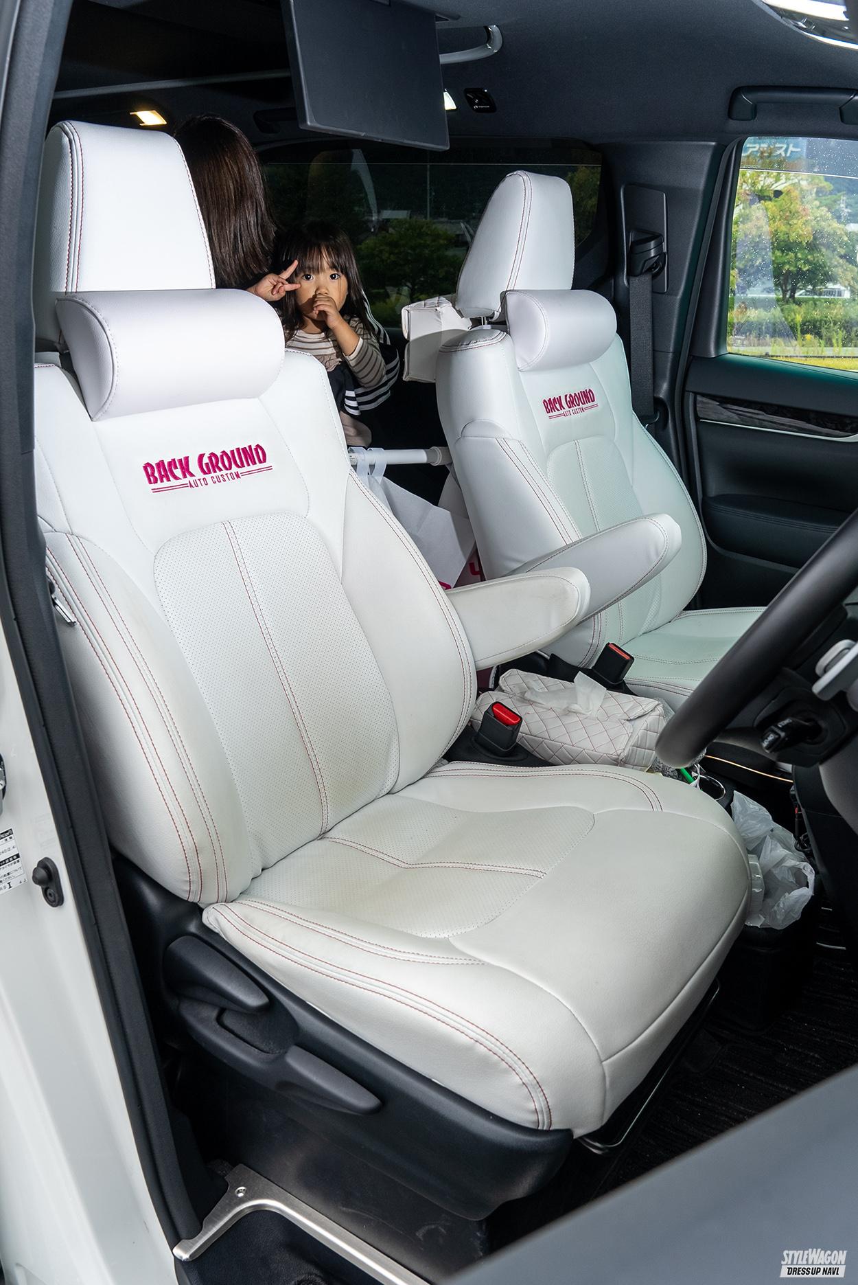 特別刺繍入りのシートカバーもホワイト仕立て!