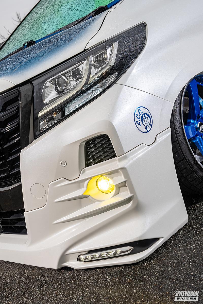 とにかくドラえもんが好き過ぎて愛車の至る所にドラブルーがあしらわれた山本さんのアルファードは、ローハンが手がけるグラインダータトゥーやマイナスインセットのBST2ホイールまで青色に染められている。また、製作ショップである「アマプリ工房」に無理を言って実現させたエアサスを介してのローフォルムは、言われなければ4WD車であることを感じさせない地を這う完成度。これを実現するために企業ヒミツ満載の足まわりには各社のアーム類だけでなくワンオフ加工も投入し、リアタイヤに至ってはキャンバー角のせいで路面との接地面積が激しく縮小。スタッドレスタイヤを履いたところで、雪道でのグリップは望めない仕様と化してしまったのであります。山本さん、身から出たサビです。ドンマイ!!