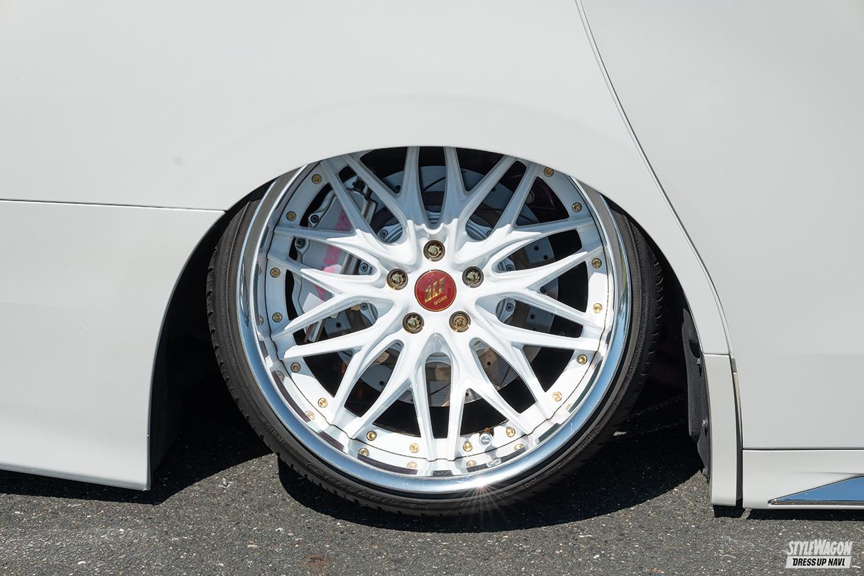 コテコテに飾り付けるのが好みではなく、純正のパーツを中心に使い、とことん低さを追求したい。そんな藤田サンの足まわりは、すべてが仲間とのDIYで完成させたもの。ローフォルムの決め手となるカズサスのエアサスを中心に、各種アーム類のワンオフやエンジン上げ加工、メンバー上げ加工などまで行なって、純正バンパーでほぼ着地というインパクト絶大なロワードフォルムを作り上げているのが圧巻だ。ちなみにキャンバー角は、停車時、走行時ともにフロント13度、リア14度というサプライズな数値。マフラーもワンオフで、より低い姿勢を実現するため、純正のサイレンサーをカットした直管仕上げにこだわっている。シュヴァートのクヴェルも、前後とともに10.5Jという極太サイズ。実はメンバーにまで塗装を施すなど、深い。