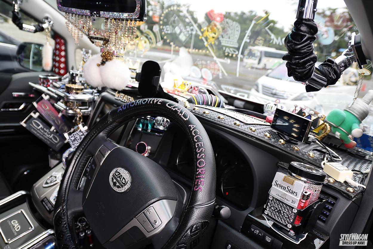 外装はシンプルに、だけどもダッシュボードまわりが華やかなアルファードが気になる……。ヨイショットさんの愛車のダッシュボードはDAD製品を中心にデコレートされている! 繰り返すが、外装はシンプル。ヘッドライトは加工品だが、コレもこれ見よがしではない。ピラーパネルはキラキラしているが(平板なパネルにDADのステッカー&クリスタルを貼り込んだ)。車内のコンソールボックスも自作でクリスタルを貼り込むなど、地道に細かい作業を行える人なのです!!