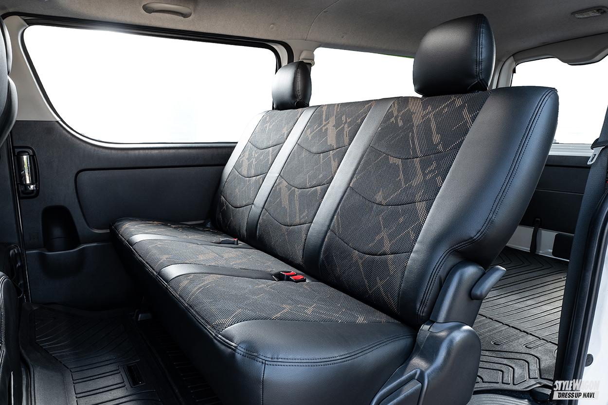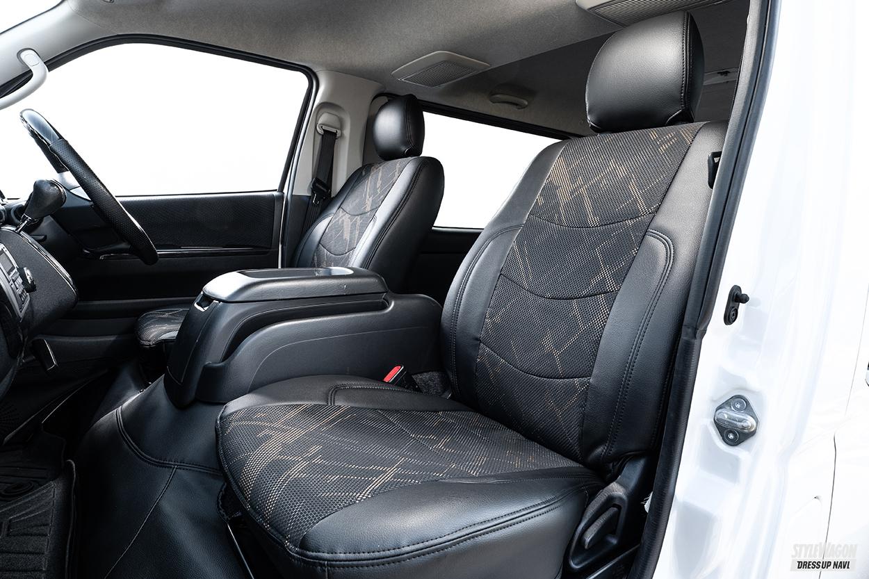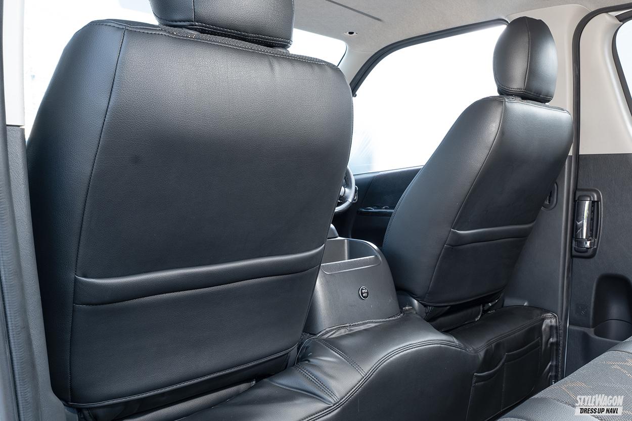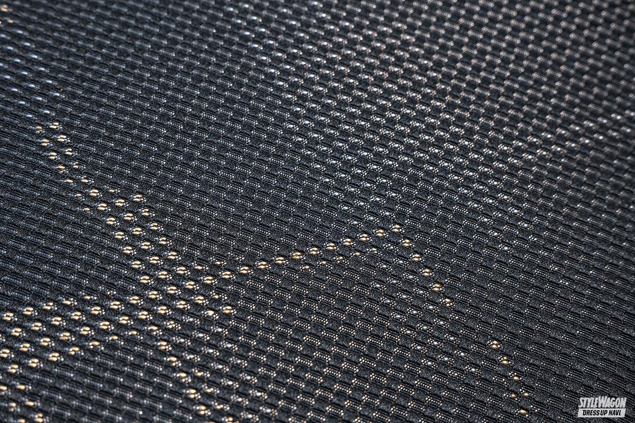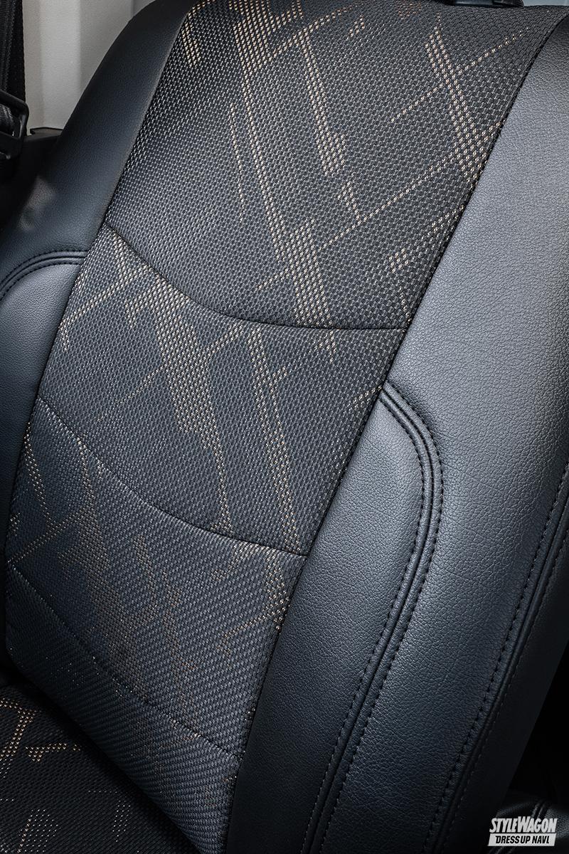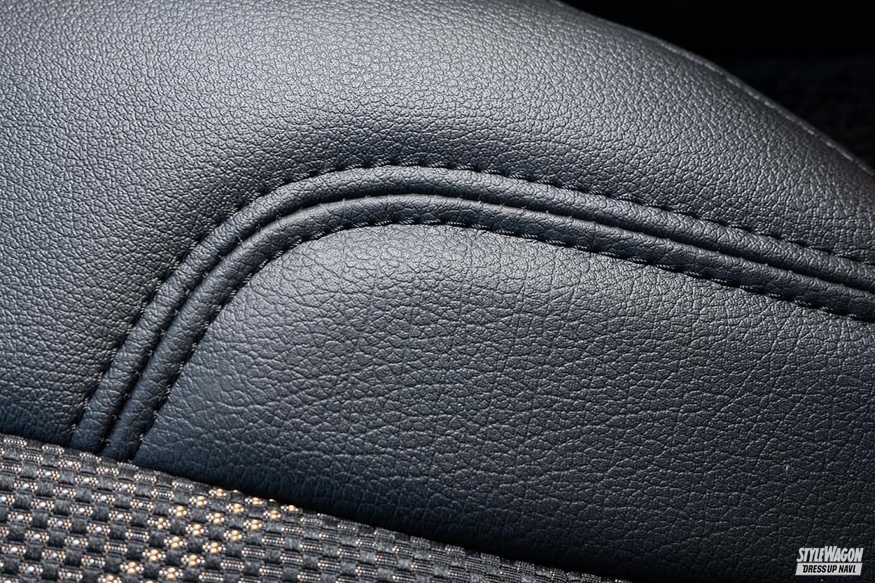 なんと言っても特徴的なのは、シート中央部。凹凸のある蜂の巣状のハニカムメッシュを採用することで、優れた通気性を発揮。汗をかいたとしてもベタつかない、さらっとした肌触りで、夏場はもちろん、季節を問わず、快適性を確保している。また、メッシュ部分の網目にカラーを配した、欧州テイストが薫る独特なデザインは、車内の上質感を底上げしてくれること間違いなし。センターはポリエステル素材のメッシュで、シートサイドはソフトタイプのPVCレザーとなり、クション性もバッチリ。アクセントとなるダブルステッチも高級感アップに貢献。高品位な座り心地とオシャレなビジュアルを両立した逸品なのだ。