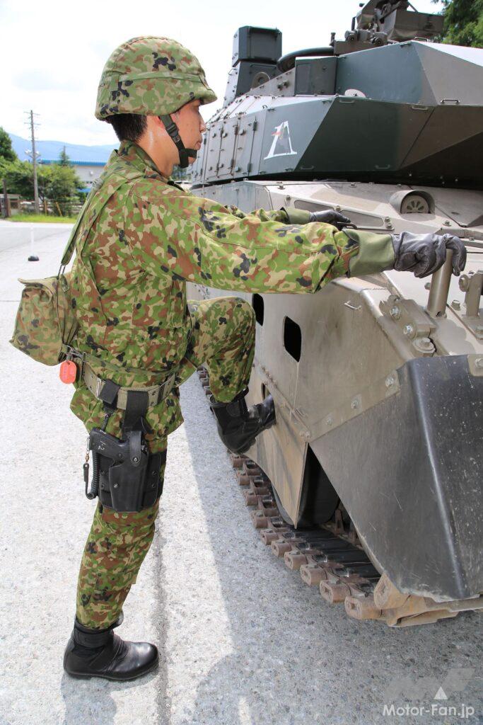 乗降体験は車両担当の自衛官が横について、その手順を丁寧に説明することから始まる。そもそもRCVのような装甲戦闘車両の「乗り口」がどこにあるかが我々にはわからないからだ。外観がクロカン4WD車然とした軽装甲機動車や高機動車、1/2トントラック(通称パジェロ)などはドアを開けて乗降すればいいのは我々にもわかる。
