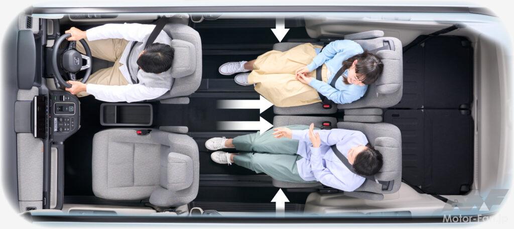 先述したように、ノア/ヴォクシーは、横スライドしなくても2列目シートのロングスライドが可能になっている。一方で、ステップワゴンは、横スライドが加わり、内に寄せると865mmのロングスライド、外寄せ時だと610mm。左側シートの横スライドは、最大115mm、右側シートの横スライドは75mmとなっている。ステップワゴンは、一旦内側に寄せる必要があるが、ロングスライドでは、足元空間を120mm広くできる。