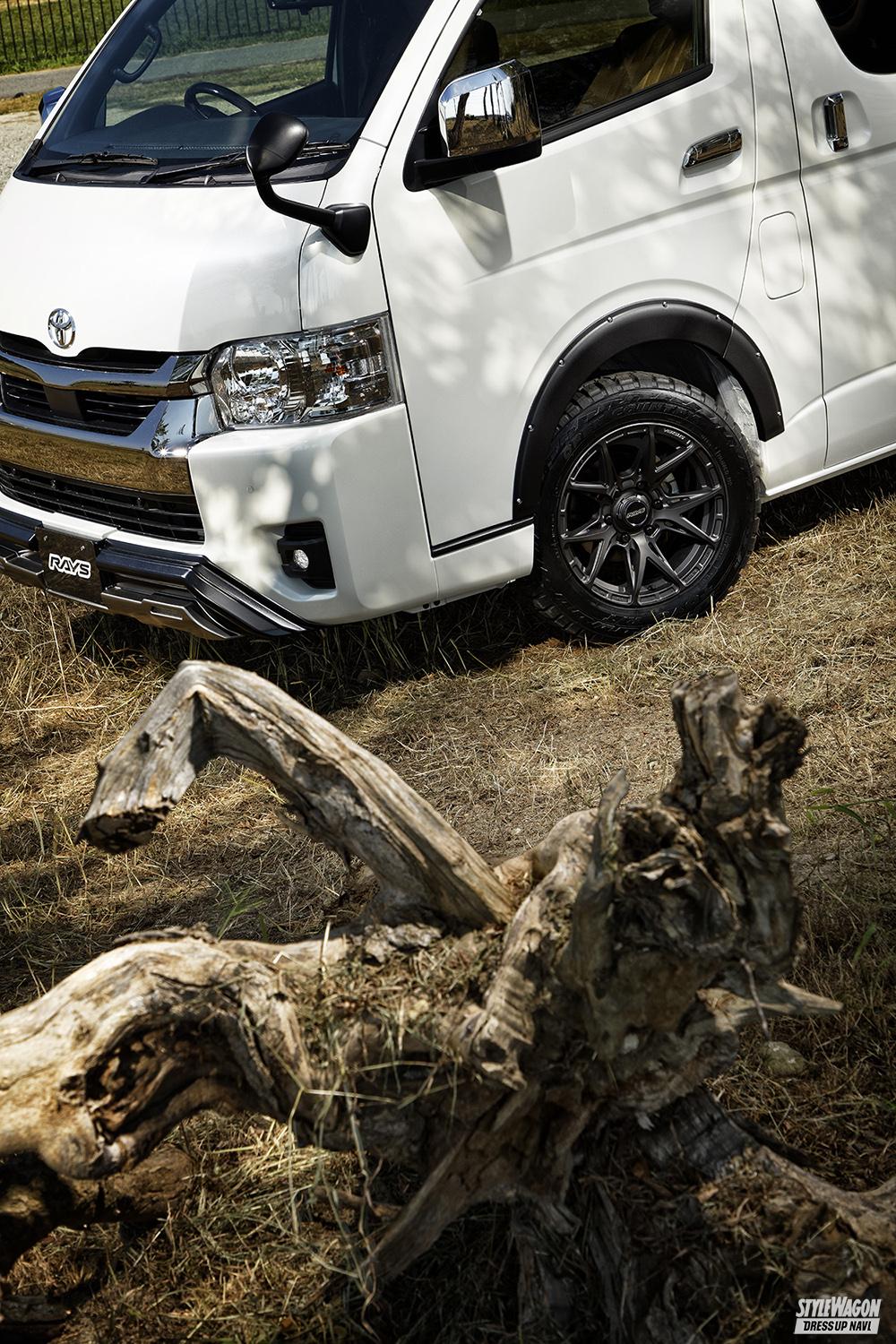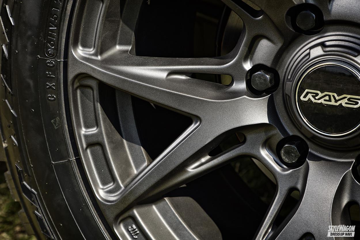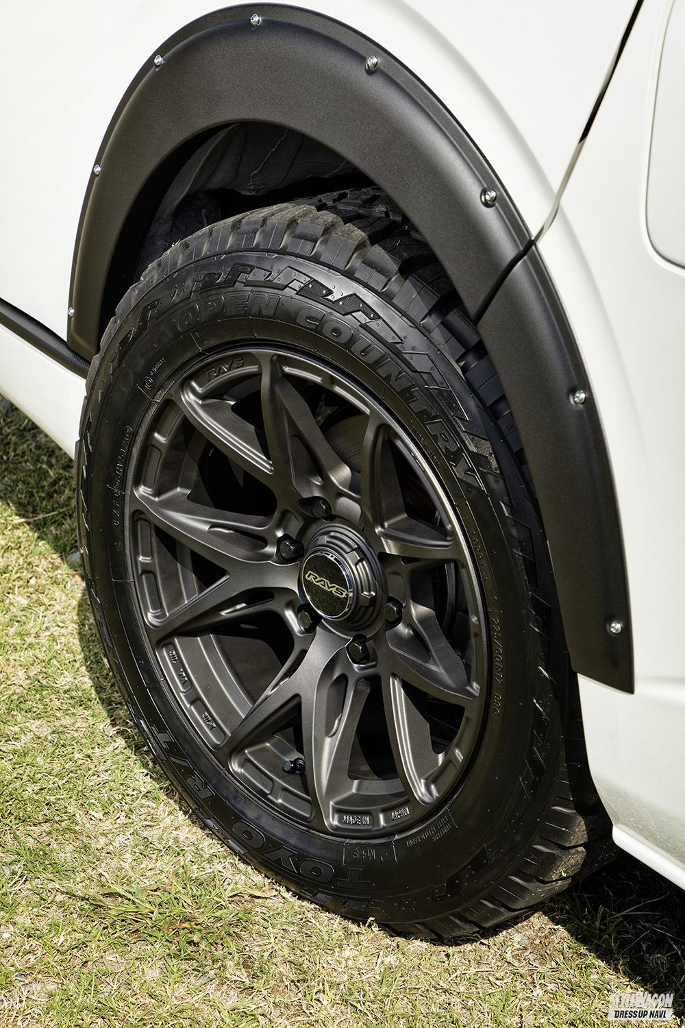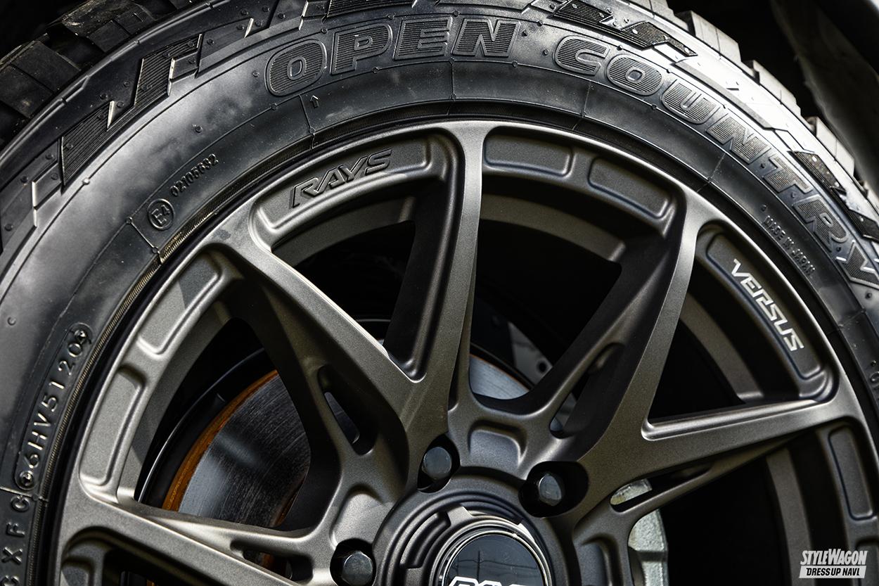 また、一方でタフネスの演出も抜かりない。グラムライツのいわゆる“X”モデルにも採用される『スピードブリックリム』を搭載。フランジの強度アップと同時にラワイルドな雰囲気の注入を達成し、200系乗りが求める無骨な足元作りにも貢献する。