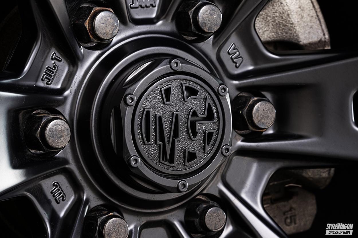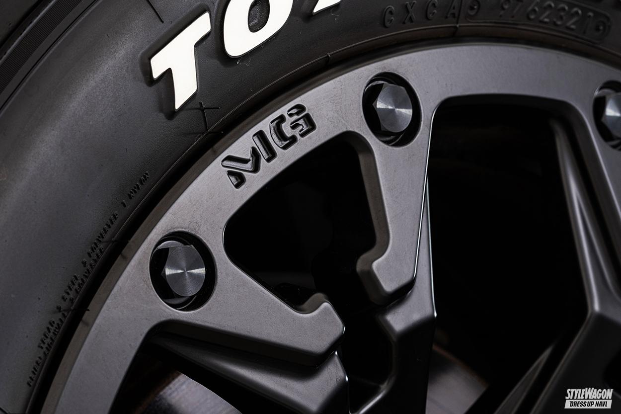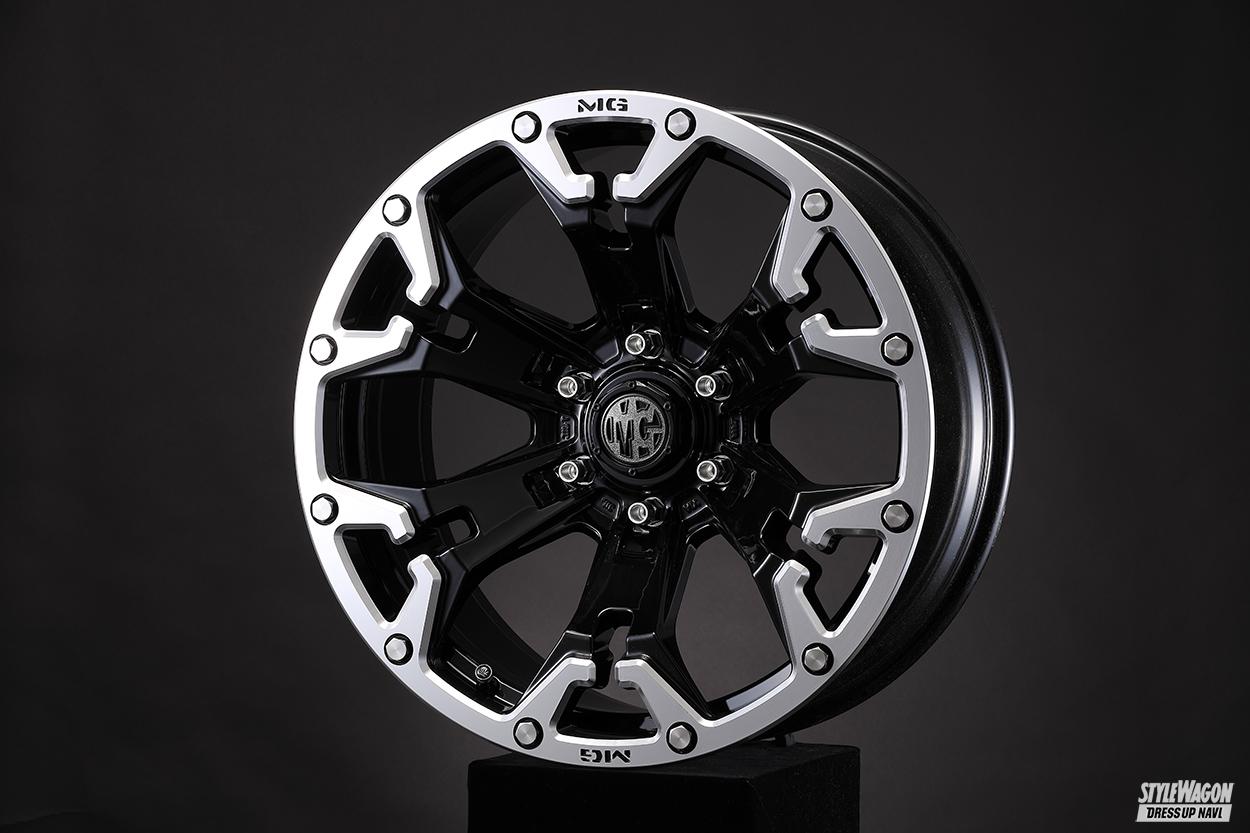 今回フォーカスするゴーレムは旬のオフテイストを強く醸すビードロック風のリムと、エッジが効いたゴツめの6本スポークで魅せる大胆な意匠の意欲作。シリーズ初となるオープンナット仕様とすることで、スポークがリムへ向かい急激に落ち込コンケイブフェイスの深さに磨きをかけた。さらに、MGシリーズで多くみられる大型のピアスボルトをリム外周部にレイアウトしてアイキャッチ化すると同時に、ダギング風ロゴのクールなオーナメントが存在感を強く主張する。
