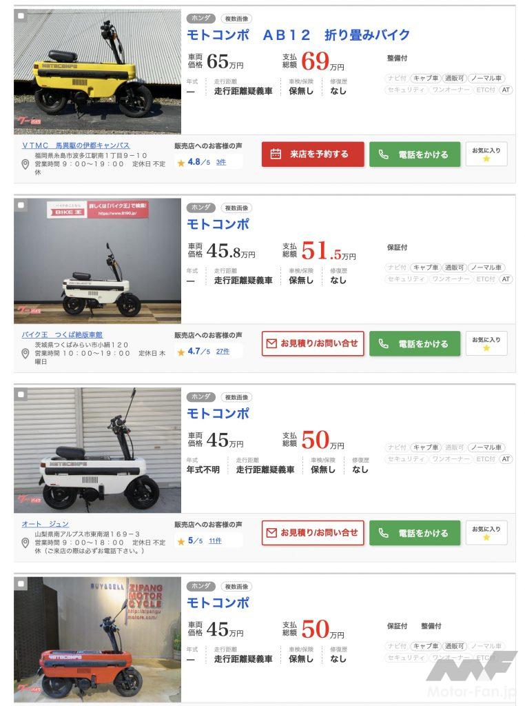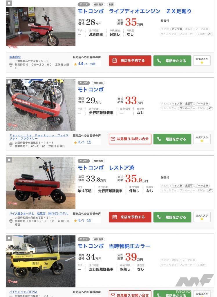いやいや、モトコンポなんだからもっと安く買いたい!と思う人もいるだろう。そこでグーバイクに掲載されている中古車を安い順に調べてみると、これがまぁ高い。最安値は28万円で諸費用を入れると35万円。価格が高いものでも支払総額でみると35万円から40万円といった相場感のようだ。