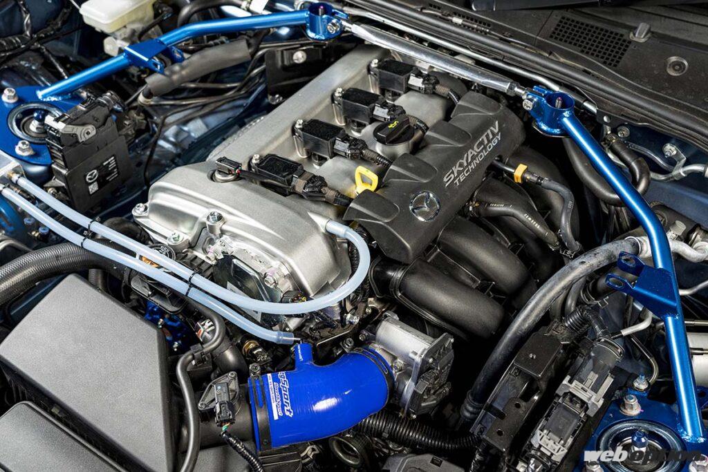 「ボア径を広げたり、ポートを削ったりしてポテンシャルアップできた昔のエンジンと違い、スカイアクティブGは手を加えようがない素材なんですよ。実は速さを引き出すためというより、オーバーホール時の楽しみすらない現状をなんとかしたいと思って、エンジンスワップでの排気量アップへ取り組みました」と語るのは、レッグ代表の倉迫さん。