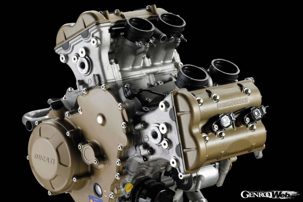 市販車がベースのスーパーバイクレースでは、L型2気筒エンジンを採用してきたドゥカティが、MotoGPクラスに参戦するにあたり、L型4気筒16バルブエンジンを採用した。レプリカモデルであるデスモセディチRRもドゥカティの市販車として初めてL型4気筒エンジン16バルブエンジンを搭載。もちろんバルブ駆動はデスモドロミックだ。余談だがセディチとはイタリア語で数字の16で、デスモセディチとは「デスモドロミック駆動の16バルブ」という意味。クワトロバルボーレ(4バルブ)やテスタロッサ(赤いヘッドカバー)などと同じく、説明的な言葉なのになんだかカッコいいからイタリア語ってずるい。
