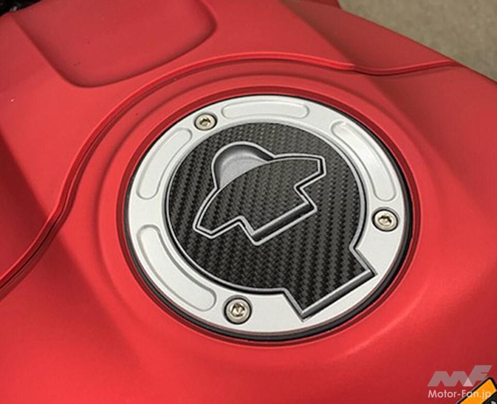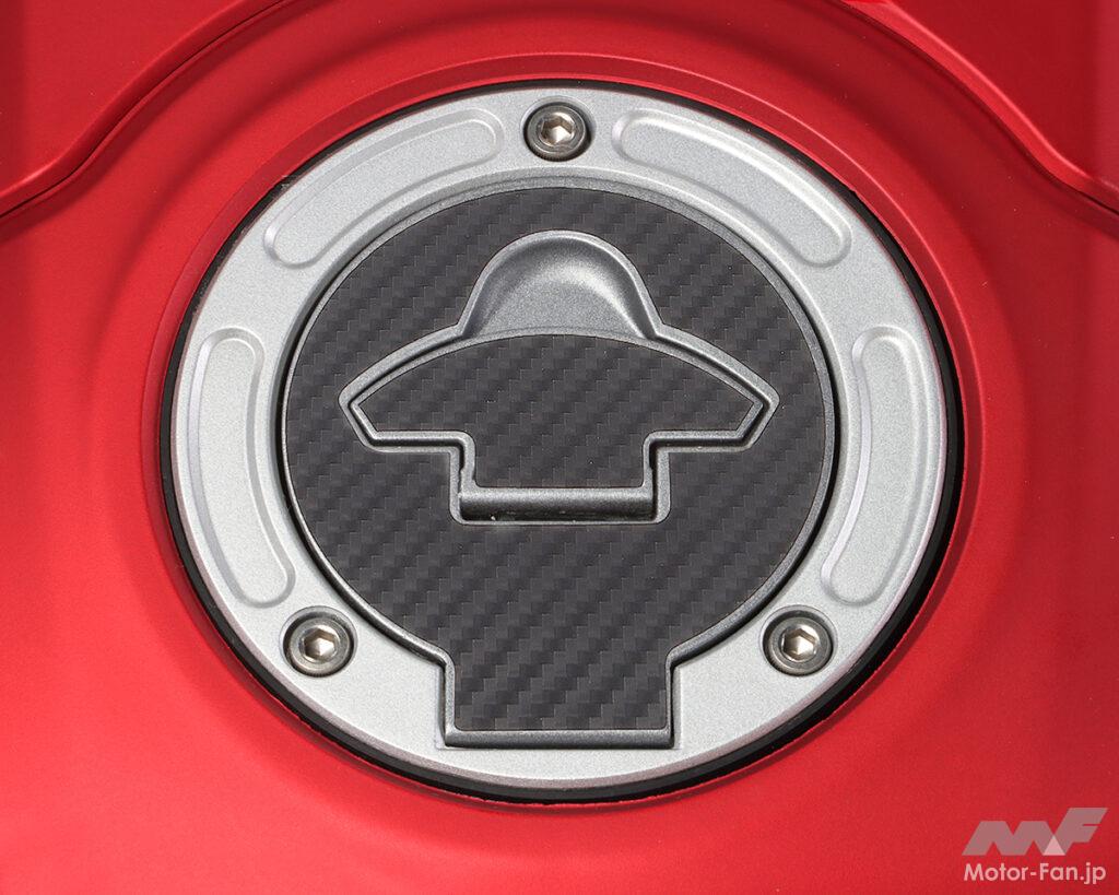 こちらもキタコがリリースした注目の新製品「タンクキャップデカール(ヤマハtype1)」。カーボン調ステッカーでフューエルタンクキャップをドレスアップ。ステッカーを貼ることで傷付き防止にもなるのも特徴。