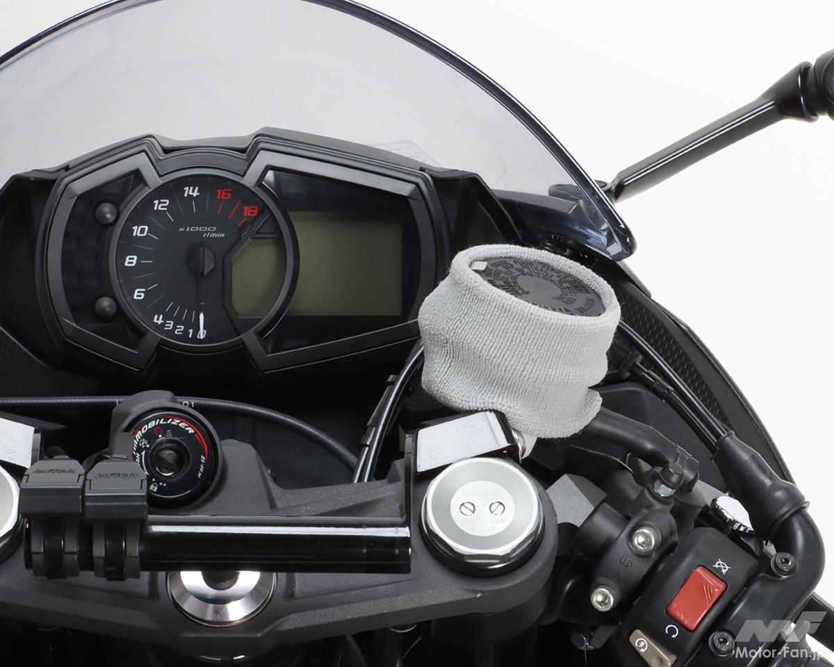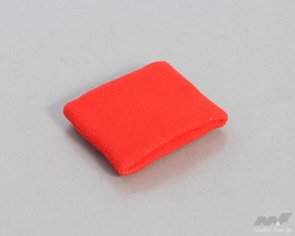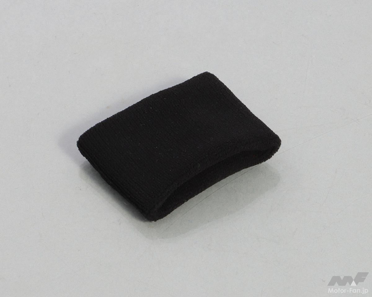 写真はキタコの高性能コンビニパーツブランド「K-CON Pro」からNEWリリースされた「リザーバータンクソック」。液体の吸収性が良く、伸縮性にも優れたパイル生地を採用し、高いフィット性能を獲得。フルードの漏れや飛散をしっかりと防止してくれる。カラーは4色あり。