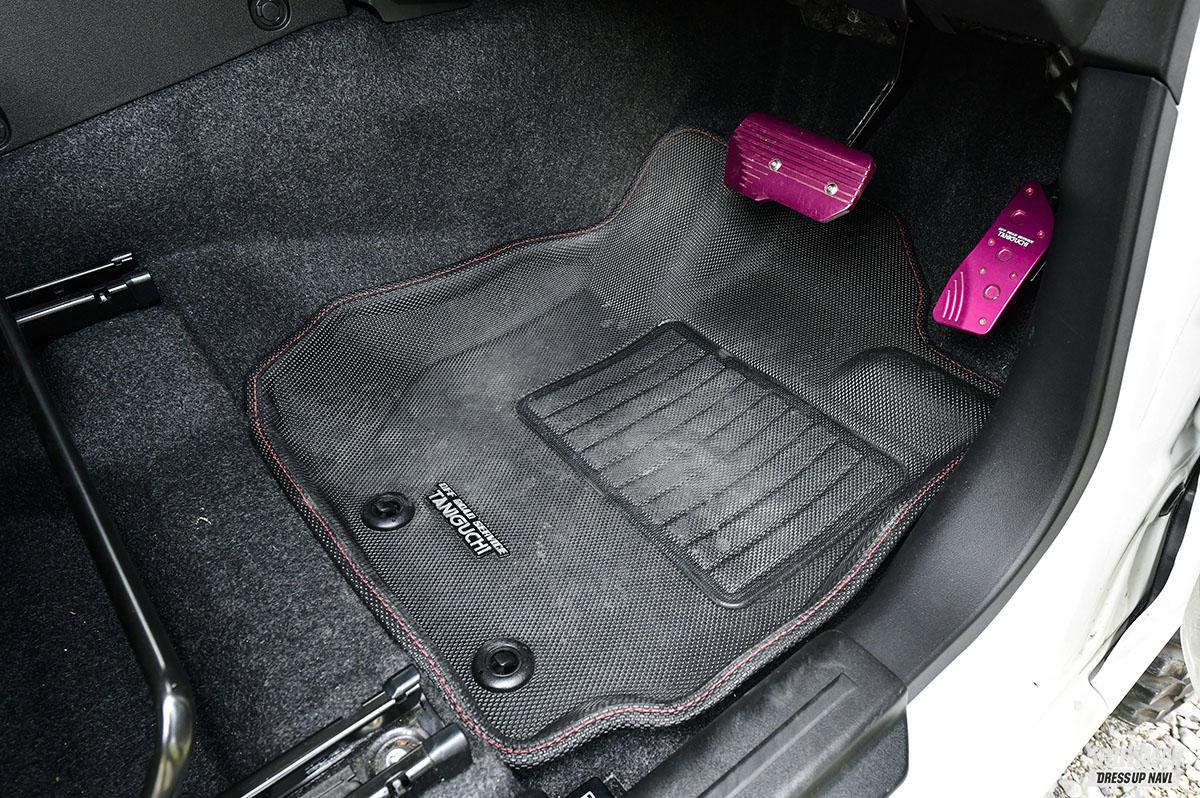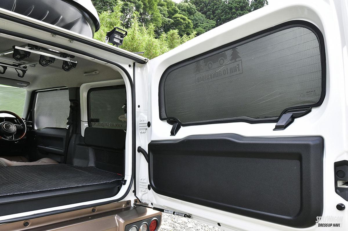 さらにロトパックスに手洗い水を確保し、オルトリーブにすぐに処分できるゴミなどを入れ、車内に持ち込まない。こんな、ちょっとした工夫は実際にアウトドアを経験しないと気が付かないのだ。フロアマット一つとっても、立体ラバー仕様とすることでカーペットを汚さずに靴について車内に入ってしまった汚れを簡単に車外へ出すことができる。リアマットは、防水、防汚性に優れ、丸洗いOK。谷口氏の経験がリアルに具現化されている、いわばアウトドアアクティビティジムニーがタニグチのJB64なのだ。