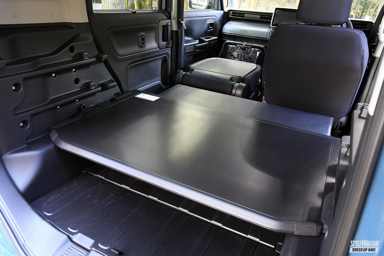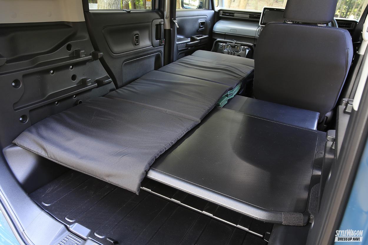 ラストは遊びグルマとしても注目の商用バン、スペーシアベース。スペーシアカスタム同様の顔付きは商用車らしくなく、カジュアル。ボディ色のデニムブルーメタリックもお洒落です。4人乗りですが後席は完全に商用車モードのエマージェンシー扱い。子連れで使うのは厳しそうですね。最大の特徴は荷室に標準装備されるマルチボード。高さを3段階に変更可能で、テーブルとして使ってリモートワークもできちゃうんです。フラットスペースは2m級と十分すぎるほど広いし、屋根が高いので寝床に座っていても圧迫感もなし。寝る前に車内でダラダラしている時間って結構楽しいんですよね。一晩寝た感じでは、不満もなく超快適。これはぜひソロキャン好きに進めたいクルマです。強いて言うならば、長距離移動が楽なターボの設定が欲しいなぁというとこですかね。それ以外は最高でした!
