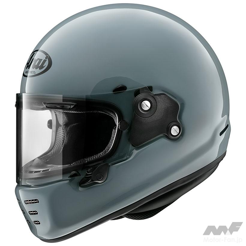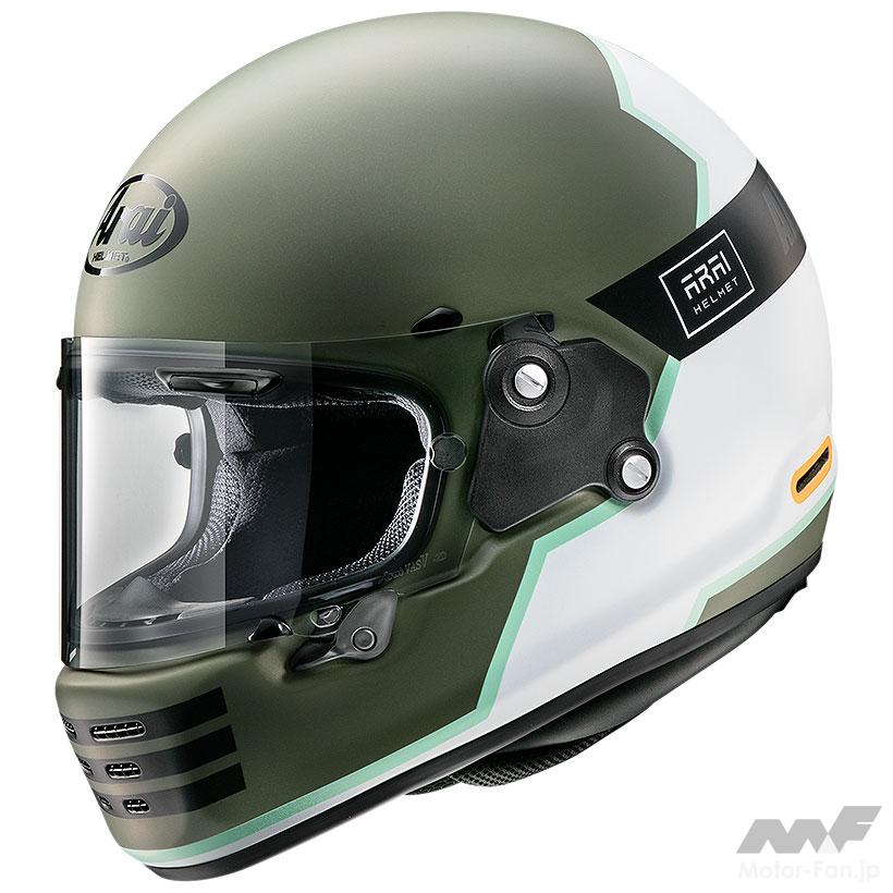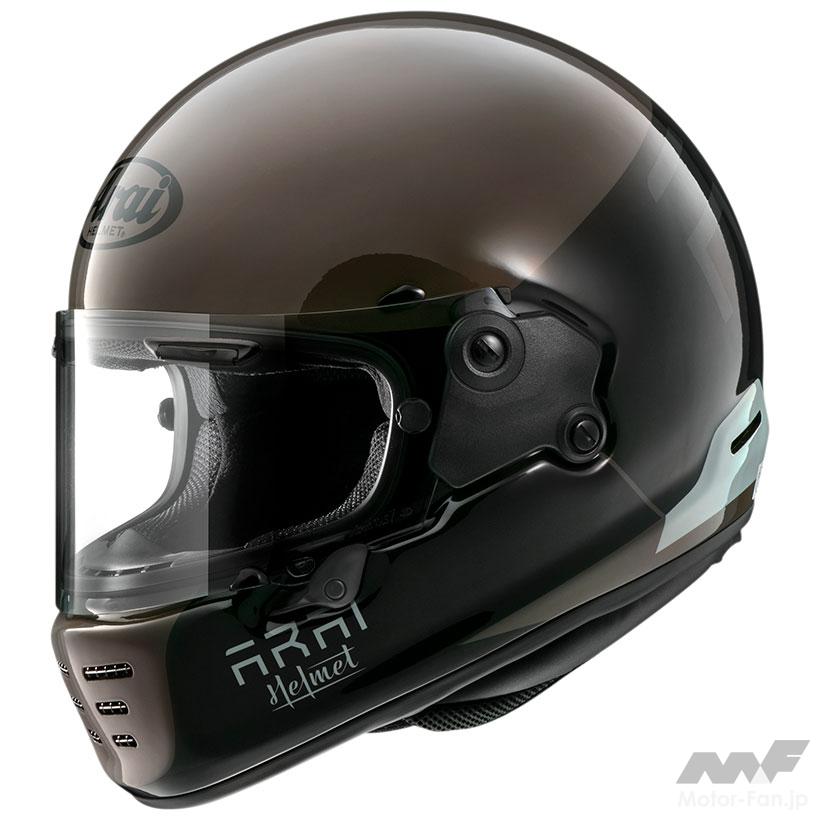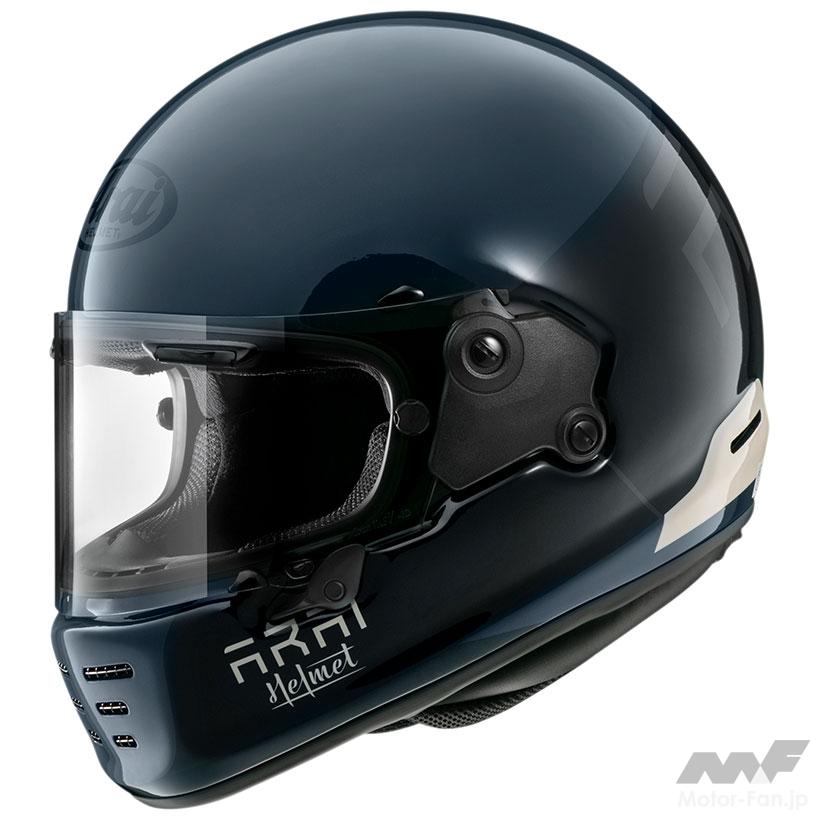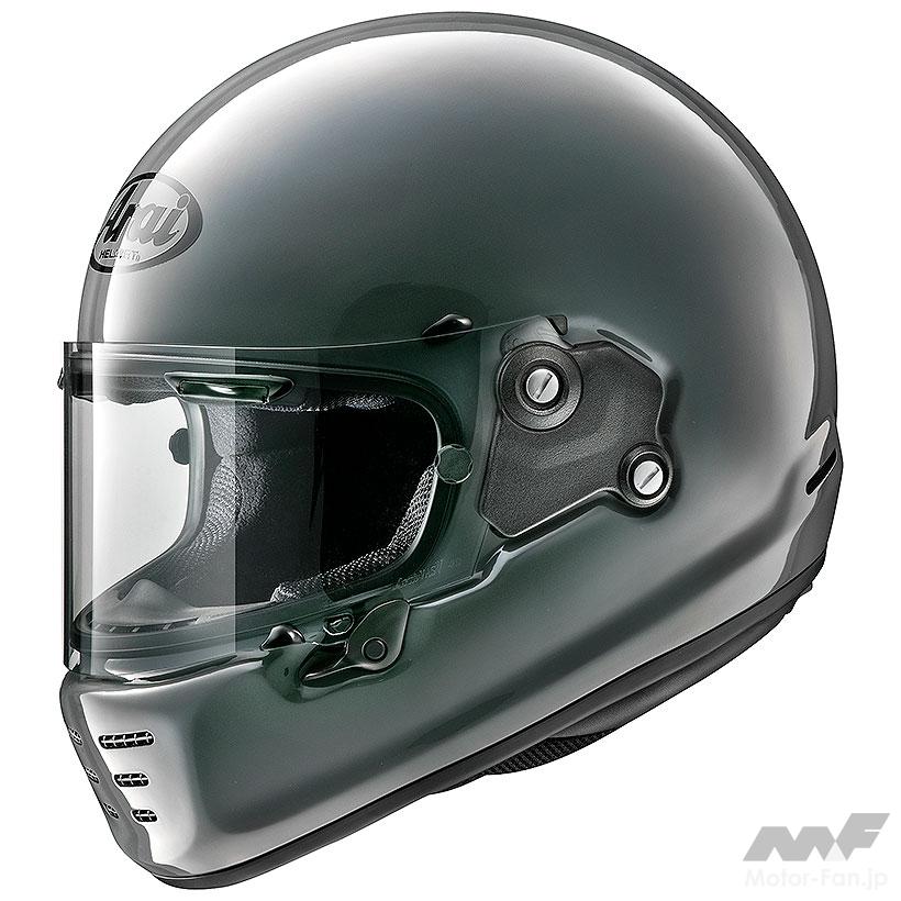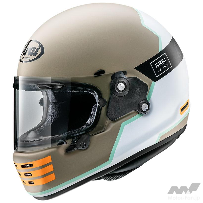 フルフェイスヘルメットのスポーツツアラータイプ。帽体開発にCFD(3次元数値流体解析)を使ったエアロダイナミクス形状を採用。軽量な本体とあわせることで、ロングツーリングでのライダーにかかるストレスを軽減する。機能性を追求した造形をシンプルに単色で見せると、レトロマシンにジャストフィットする。
