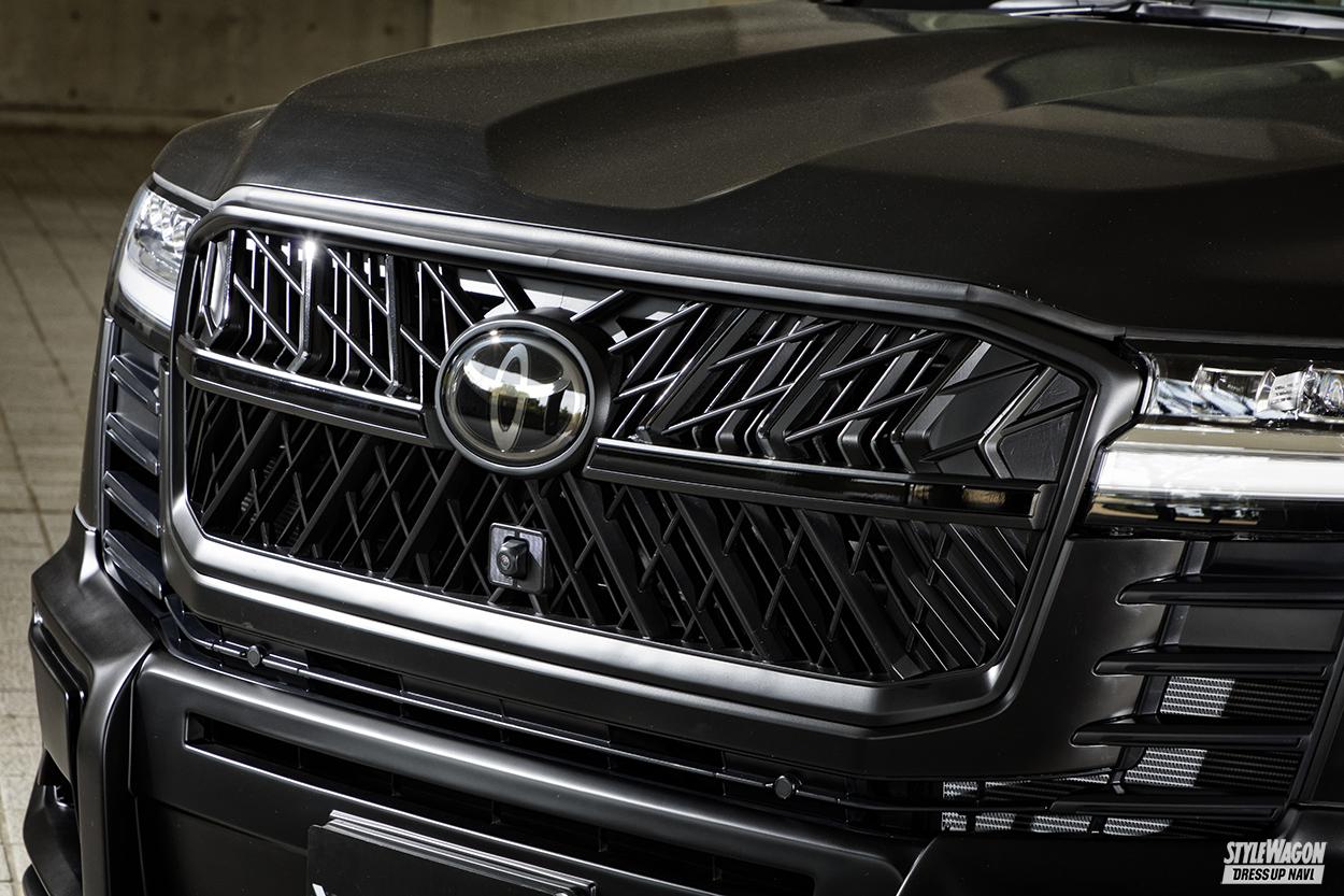 ヴァルドでは、先代ランクル200は、スポーツラインのみの設定であったが、今作ランクル300はスポーツラインよりも凝ったデザインや作り込みを施したブラックバイソンエディションからのリリース。エアロは前後ハーフタイプのスポイラーに、グリル、オーバーフェンダー、リアゲートスポイラー、ルーフスポイラー、そしてランクル200でも好評だったサイド出しマフラーという構成。前後スポイラーは純正バンパーに被せるハーフタイプとは思えない非常に手の込んだデザインが特徴。純正バンパーとの一体感も高いため、どこからがスポイラーなのかわかりにくいくらいの仕上がりを見せている。さらにヴァルドのエアロ専用となるオーバーフェンダーは片側75㎜幅で、もともと存在感の強いランクル300のボディをよりワイドに強調。最高級SUVにふさわしいインパクトと高級感に満ちたスタイルを完成させている。