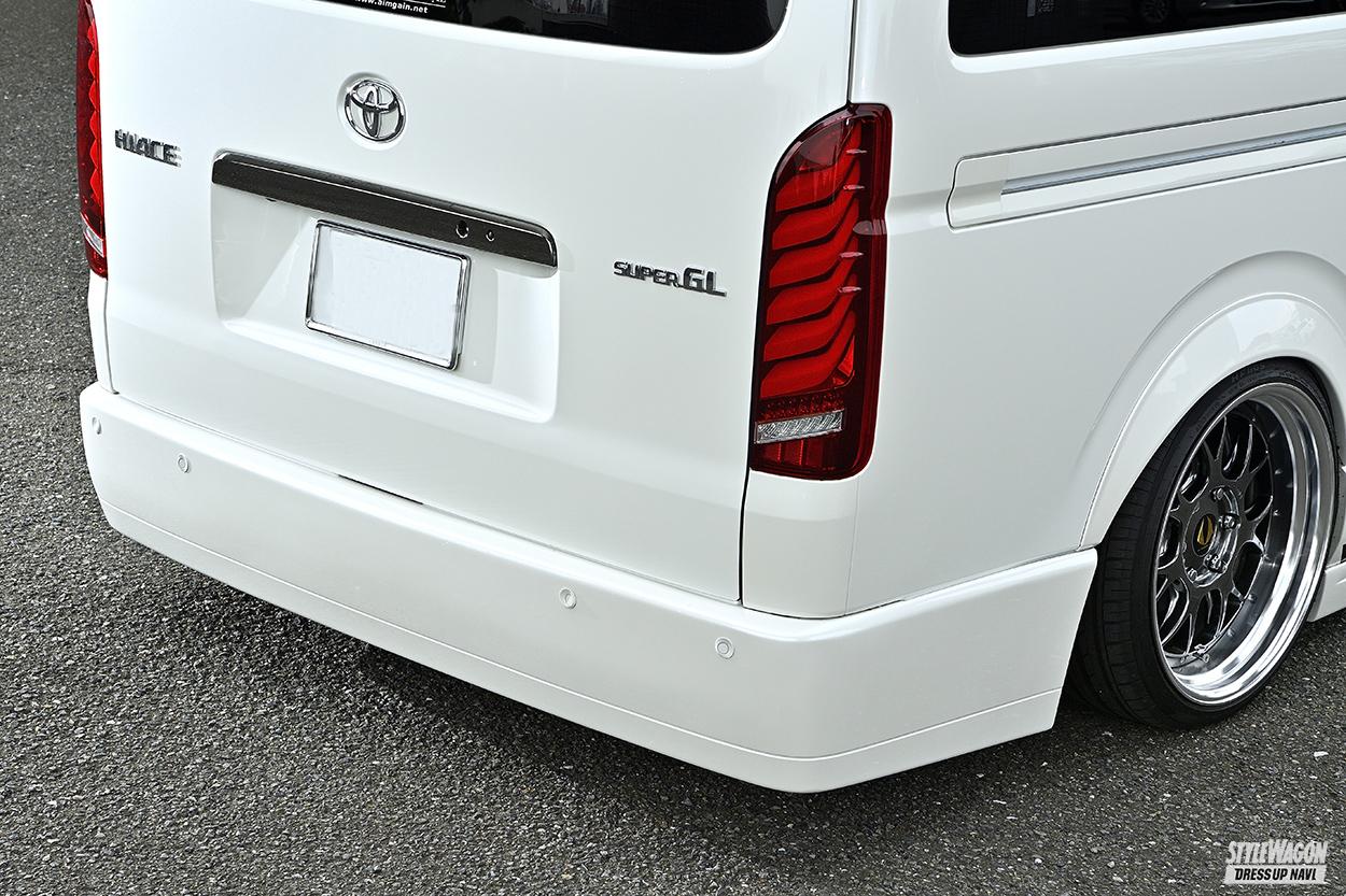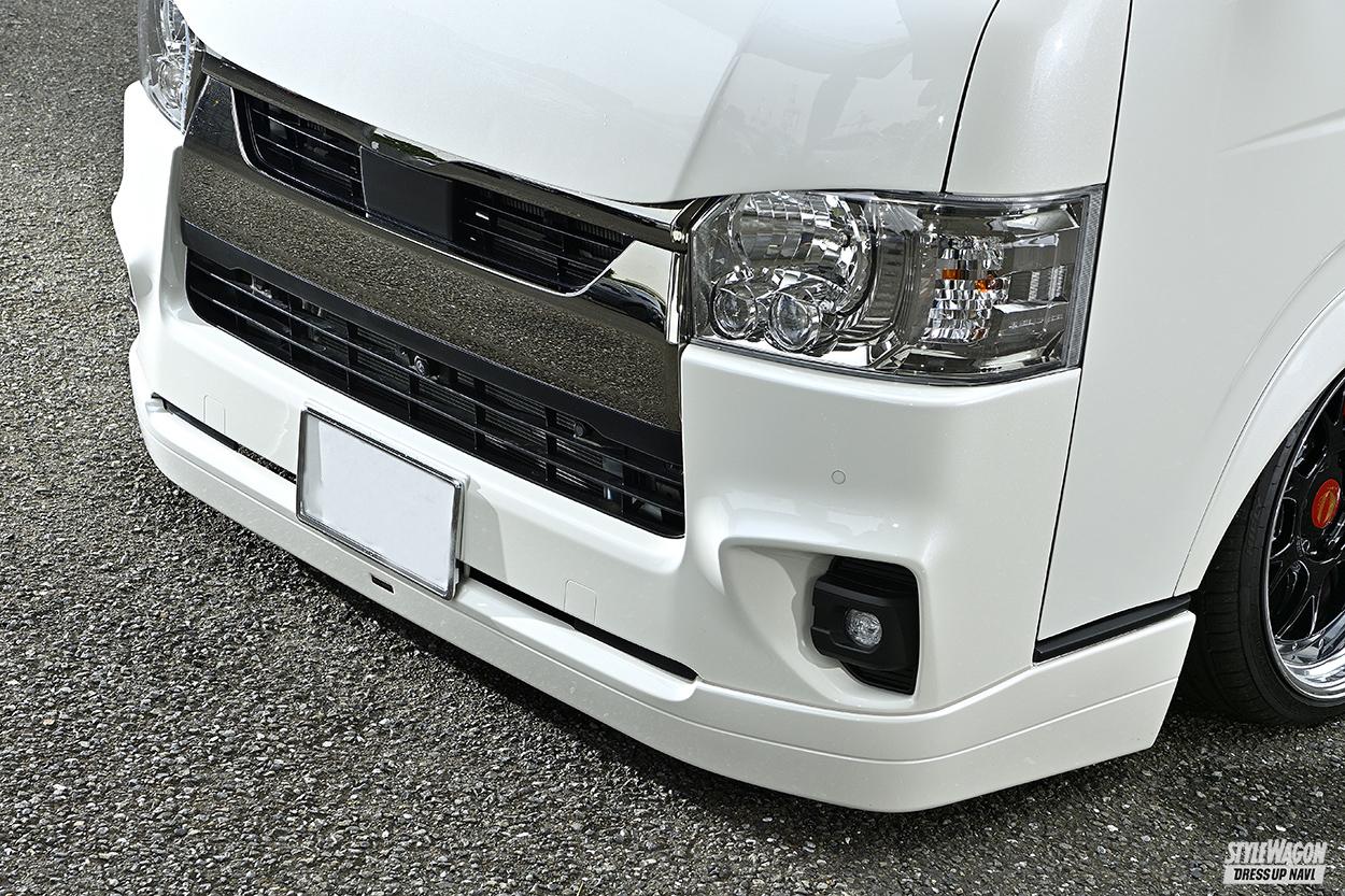 純正の、とくにボトムまわりの貧弱さを解消するハーフは、ボリューム感と大きさにこだわった、奇をてらわない手堅いシンプルフォルムが信条。フロントハーフ、リアバンパーというハイエースでは鉄板の組み合わせで、フェイスを鋭く変えるボンネットも用意。核となるフロントハーフは、純正バンパーだけでなく、デモカーが装着する分かる人には分かるマニアックなABSバンパーにも対応と、さり気ない違いをスマートにアピれる手堅いキットとなっている。対応は4型以降。現行7型もイケる。
