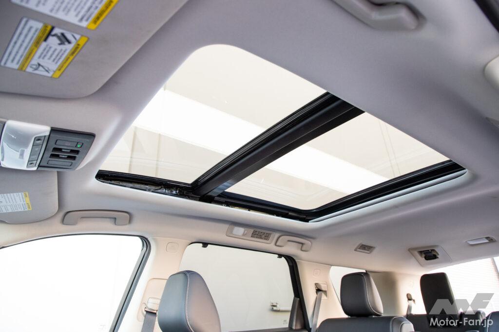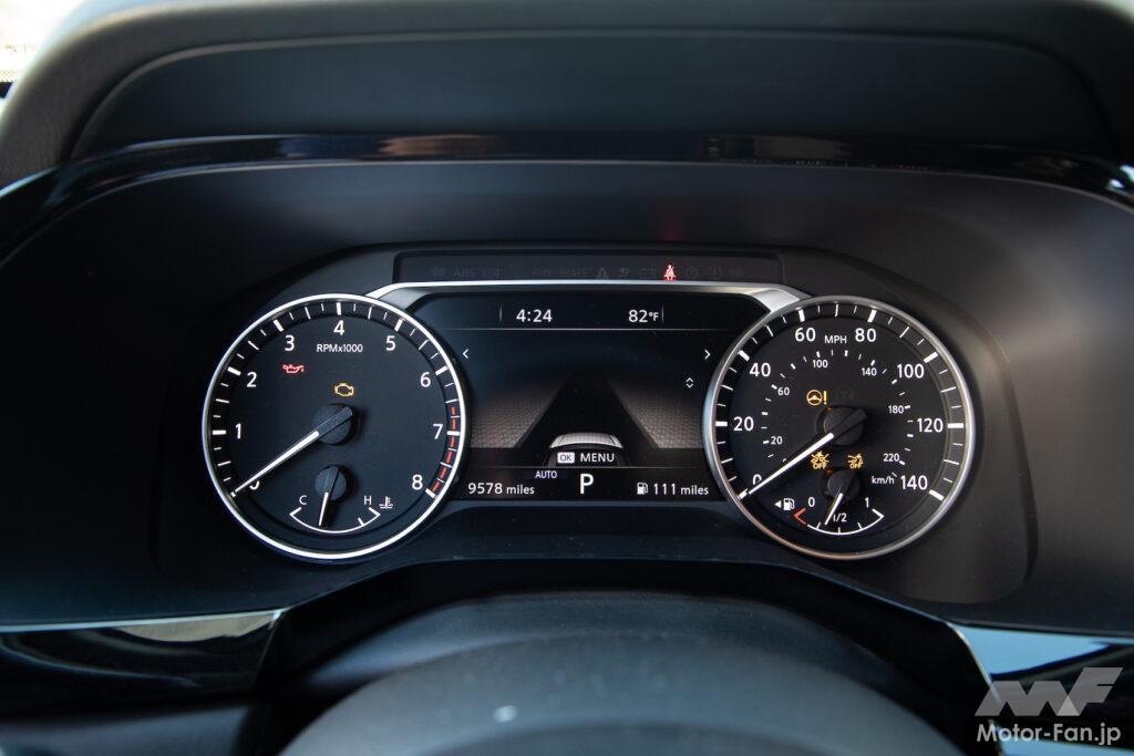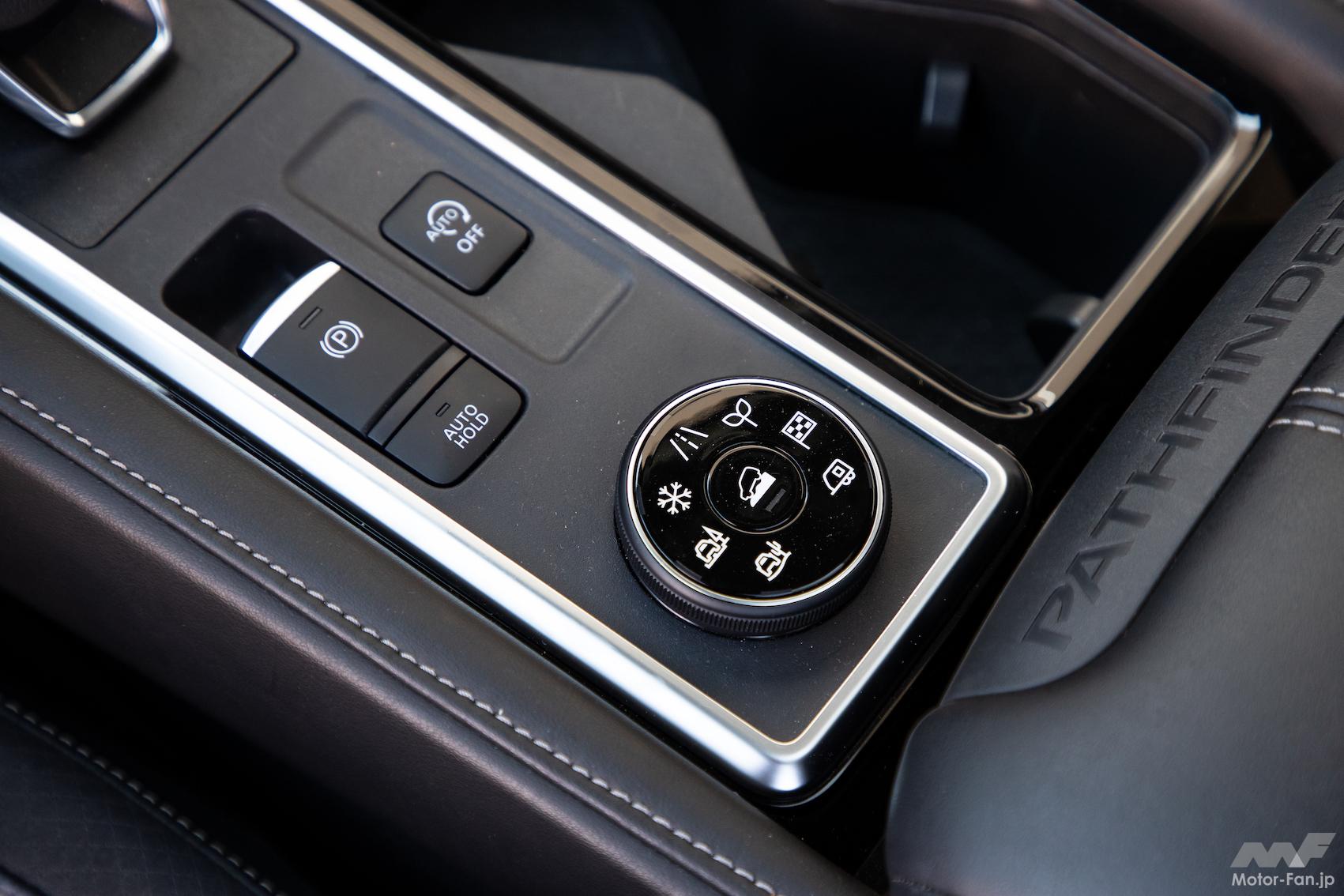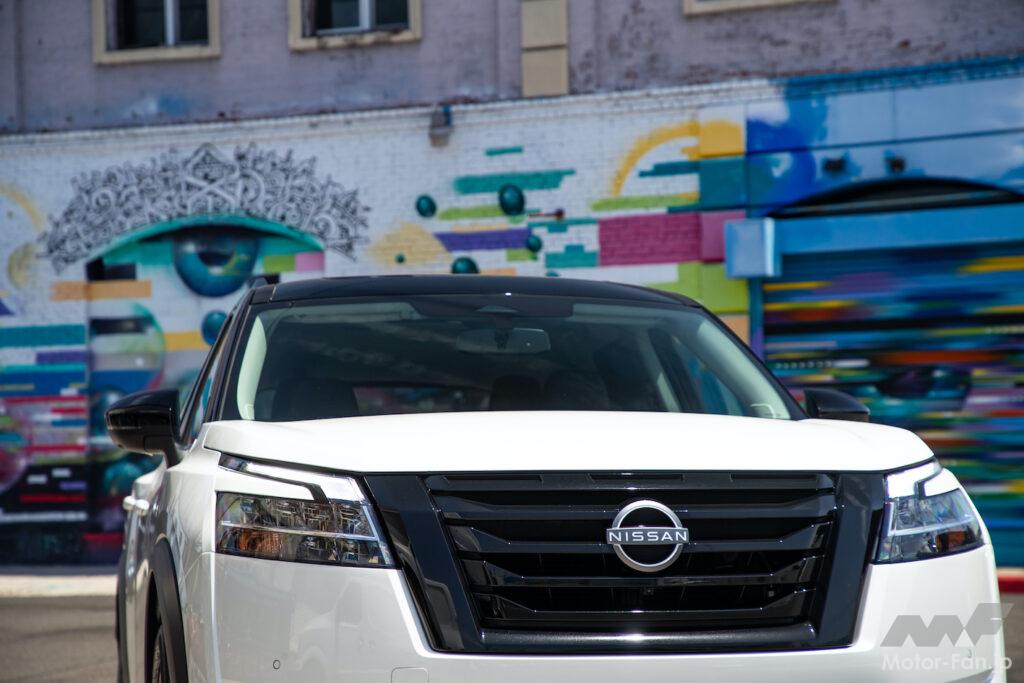 今回取材した車両は、上から2番目の「SL」の4WD車。オプションのSLプレミアムパッケージが装着され、20インチのアルミホイールを備える。ボディカラーはパールホワイトとブラックルーフの2トーン。オプションのSLブラックパッケージも備わり、フロントグリルのほか、リヤの「PATHFINDER」「SL 4WD」のバッジがブラックアウトされていた。