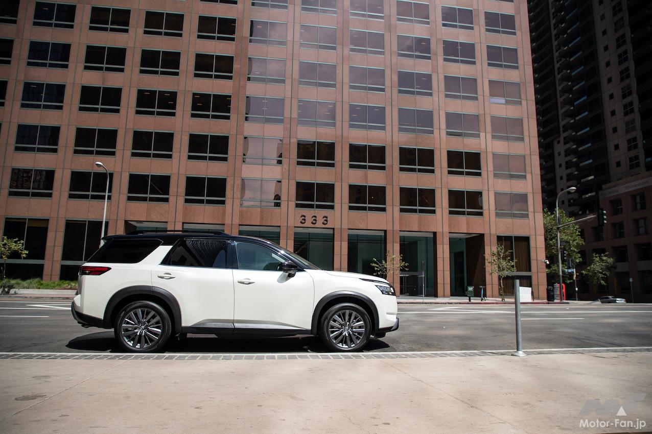 全体的なシルエットに目を移すと、先代モデルが少し流線型だったのに対して、現行パスファインダーはフロントもリヤも垂直に切り立ったボディラインが特徴。アメリカではムラーノも現役モデルとして販売されており、現行パスファインダーのスクエアなシルエットはムラーノとの差別化にも貢献している。