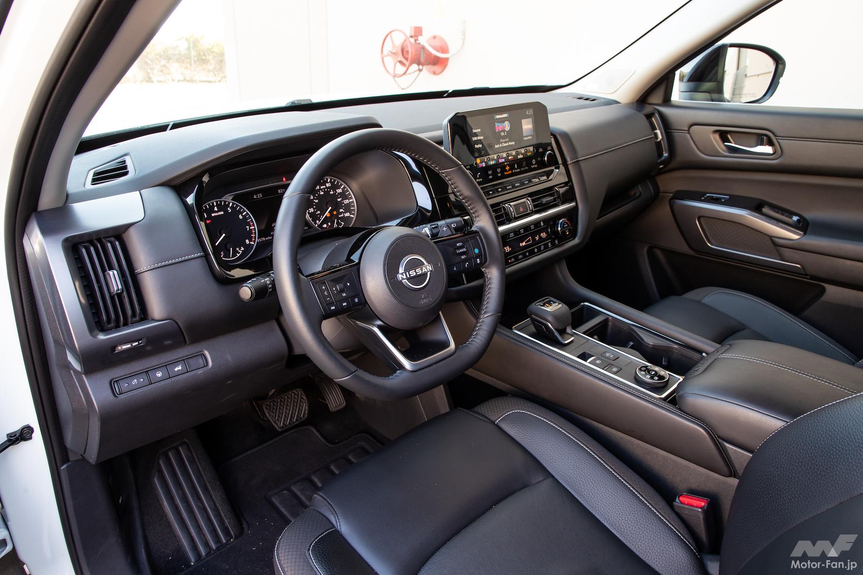 インテリアには9インチのセンタータッチスクリーンと大型のセンターコンソールが備わり、全体的には新型エクストレイルとよく似た雰囲気だ。とはいえ、パスファインダーの方がよりクロカンチックでタフな印象を強調しており、センターパネルや助手席前のインパネは外観と同じように直線を基調としたデザインが採用されている。