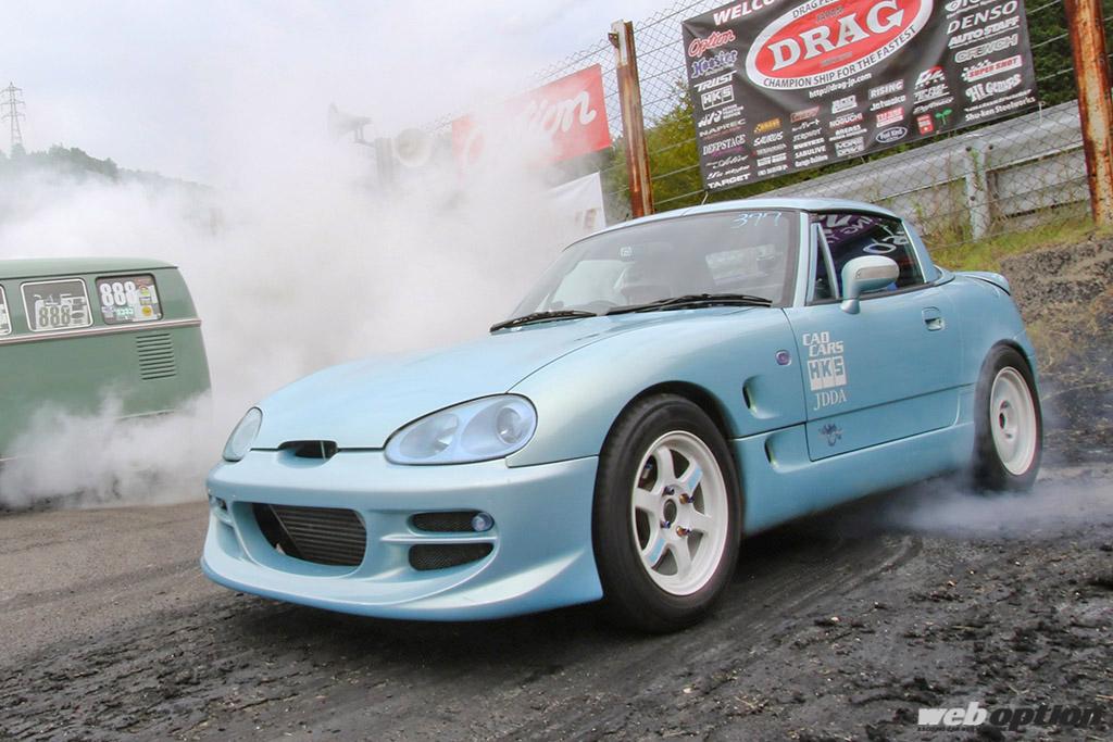 今回のドラッグフェスティバルでは、大容量ラジエターをセットして熱対策は万全のつもりだったが想定外の暑さでパワーダウン。タイヤも食い過ぎてストールするなど悪条件が重なり、ベストタイムは14秒141に留まった。今後も13秒切りを目標に走り続けていくそうなので、このカプチーノのさらなる躍進に期待したい。