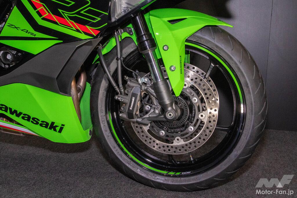 とりあえず確認したいのは、Ninja ZX-25RとNinja ZX-4Rの違いだろう。細かい部分はさておき、単純にわかりやすく見ていきたい。まず、基本的に車体関係は共通で、フレームや外装、サスペンションは同じ。最大の違いはエンジン排気量で、Ninja ZX-25Rがラム圧時の最大で49psなのに対し、Ninja ZX-4Rは通常時最大77ps、ラム圧時の最大で80psを発揮する。80psといえば800cc2気筒モデルと同等の出力だけに、400ccモデルとしては脅威的だ。エンジンの出力アップに伴ってNinja ZX-4Rのフロントブレーキはダブルディスクに強化され、前後タイヤもワンサイズ太くなっている。ホイールベースが同じなのにシート高や全長の数値が異なるのは、タイヤサイズの影響と見ていいだろう。車重はNinja ZX-4Rの方が4kg(SEモデルは5kg)重くなる程度で、ほぼ気にならない数値。電子制御はどちらも同じく、2種類のパワーモード選択や3パターンのトラクションコントロール、クイックシフター装備とリッタークラス並みに充実している。4.3インチフルカラーTFT液晶メーターはスマホアプリと連携し、各種データの閲覧やライディングログの記録も可能だ。