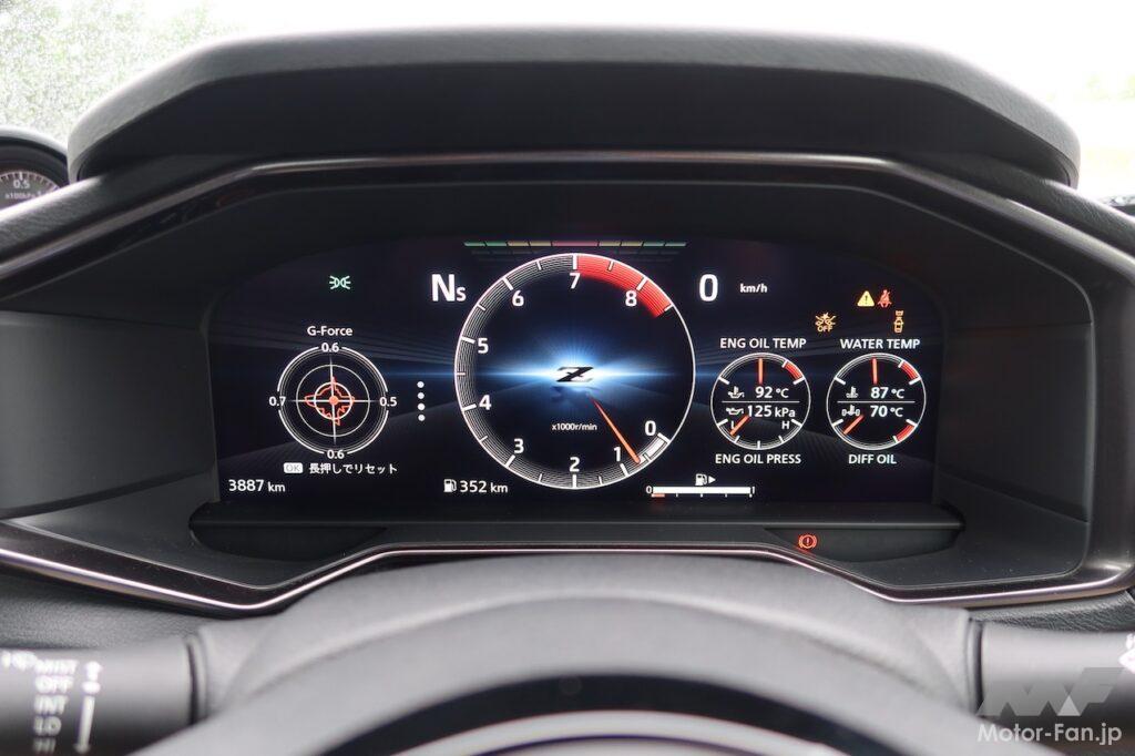 インテリアも最新の技術と伝統と歴代Zへのオマージュがほどよくミックスされている。ステアリングの奥にあるのは、フルデジタルのメーターだ。このメーター表示のグラフィックは、レーシングドライバーの松田次生選手が監修した(ほぼアイデアどおりで、開発サイドは「清書しただけ」だそう)。中央上部のレブインジケーターはまさに、レーシングカー由来である。