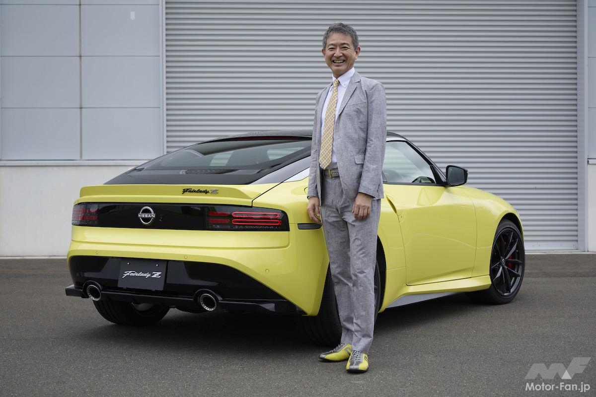 「今回のZのデザインは、ずばりオマージュ」だと、プログラム・デザイン・ダイレクターの入江慎一郎氏は説明した。その説明を聞くまでもなく、新型フェアレディZはひと目で“Z”だとわかる。ロングノーズ・ショートデッキの、いかにもスポーツカーらしいサイドシルエットは初代S30へのオマージュだし、ヘッドライトも同様。長楕円形を上下に重ねたリヤコンビランプは4代目、Z32へのオマージュだ。
