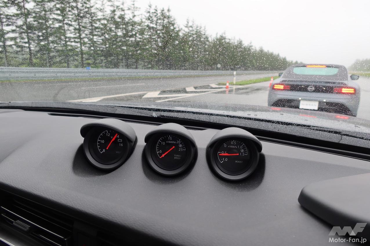 インパネ中央部には伝統の3連メーターが鎮座している。左はバッテリー電圧系、右はブースト計で、中央はターボ回転計だ。ターボ回転計採用のいきさつについては、商品企画部 ブランドアンバサダーの田村宏志氏が次のように説明する。