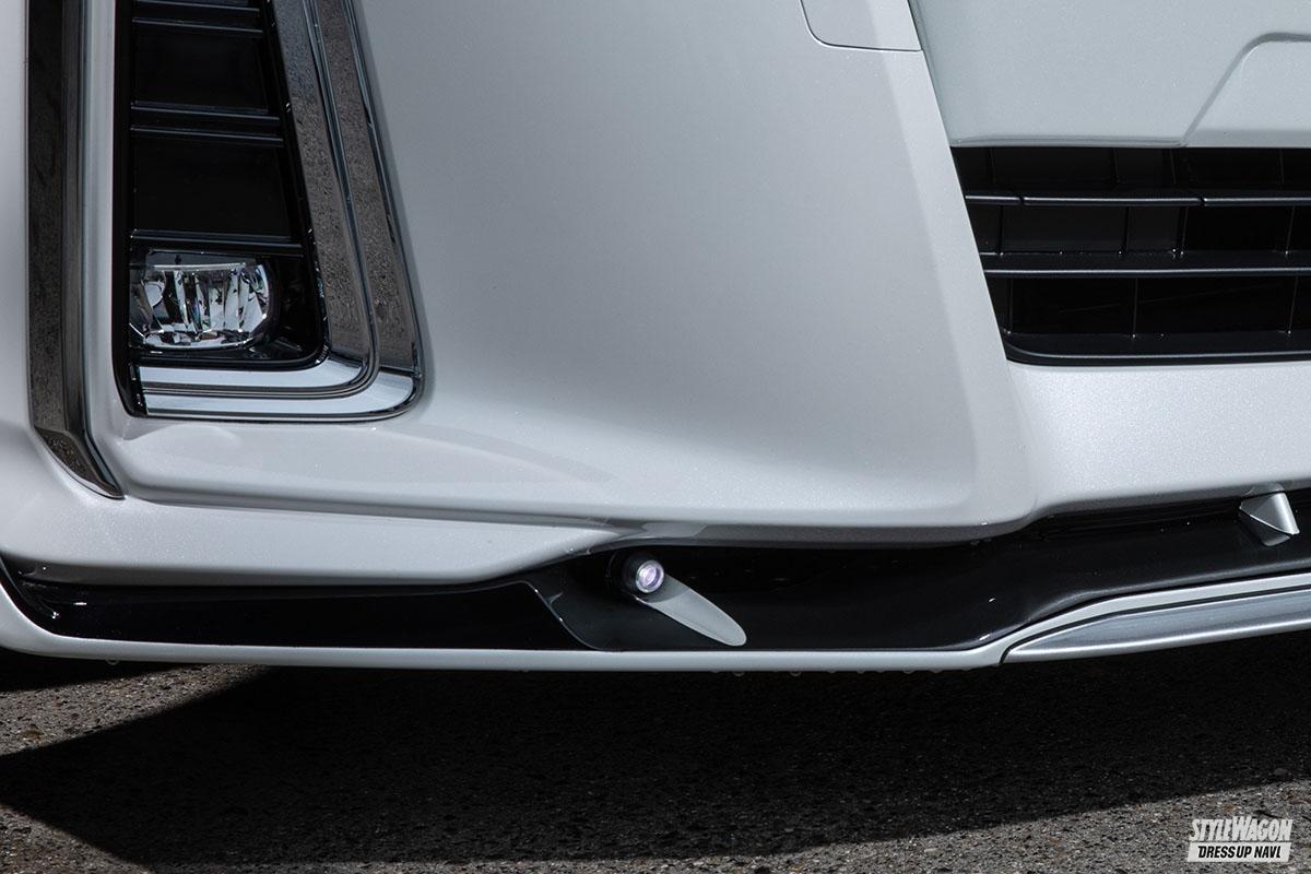 フロントフラップスポイラーはかなりの業物で、デザイン制限があるなかX軸Y軸とも動きのあるカタチ。さらに、スポットLEDをインストできるのはかなりレア。