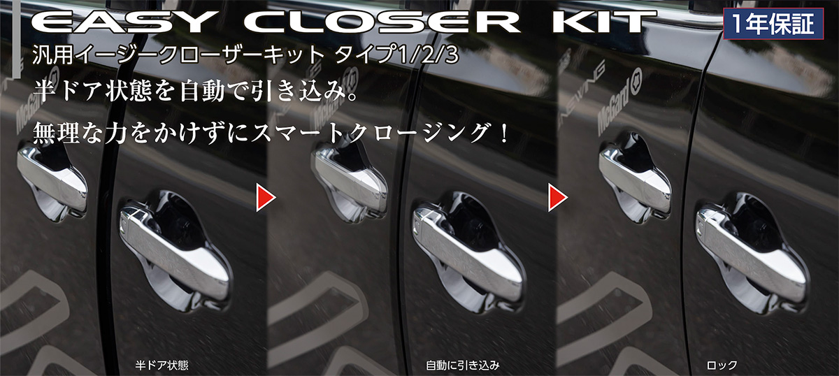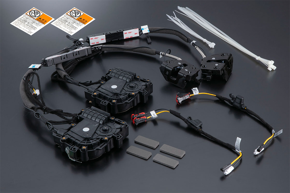 キット構成は、専用のドアキャッチ&アクチュエーター、ハーネス、注意喚起ステッカーなど、インストールに必要なパーツを全て同梱。丁寧な説明書が付属しているため、ある程度の知識があるユーザーならDIYでのインストールも可能なレベルと言える。