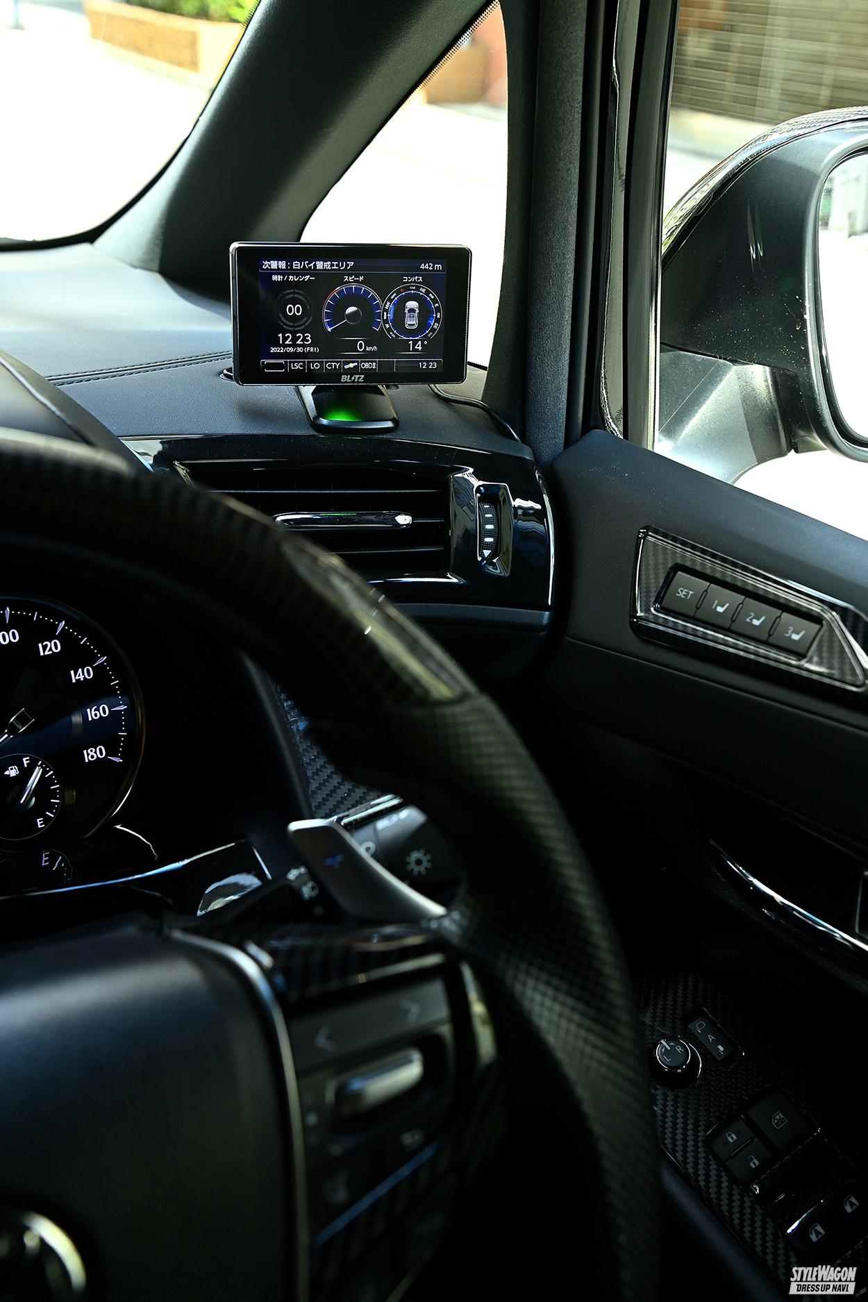 お久しぶりのアルファードクッキング。今回は茂出木さん所有の30アルファードに、レーザー&レーダー探知機を付けたよという連絡を頂いたので、早速取材に行ってまいりました! 仕事に遊びにと移動が多く、長距離を走ることもある茂出木さんにとって、レーダー探知機は必須アイテム。これまでも様々なモデルを使ってきたというが、今回はブリッツから出たばかりのTL401R。ディスプレイと本体がひとつにまとまったワンボディタイプで、画面サイズは業界最大の4インチ。第一印象はグラフィックが鮮明でとにかく見やすい。また画面が大きい故にタッチ操作がしやすいのも魅力だ。昨今のレーダー探知機は、GPSデータを元にした既存の固定オービス、重点取締ポイント、白バイ警戒エリアなどの情報量ももちろん重要なのだが、最も注目されているのは、レーザー式オービスへの対応力。TL401Rは、レーザー波の広角受信を実現し、新規設置されたレーザー式固定オービスはもちろん、突如出現するレーザー式移動小型オービスの受信警報も可能としている。さらにオプションを使ってスマホのテザリングなどにより通信を可能にすれば、別ユーザーが得たリアルタイムの警報情報をシェアできるなど、かなりの最新鋭。これならドライブ好きの茂出木さんも安心なのです。しかもオプションのOBDⅡアダプターを繋げば様々な車両情報の表示が可能になり、後付けメーターを付けたかのような満足感。これはいいとご満悦の茂出木さんなのでした。