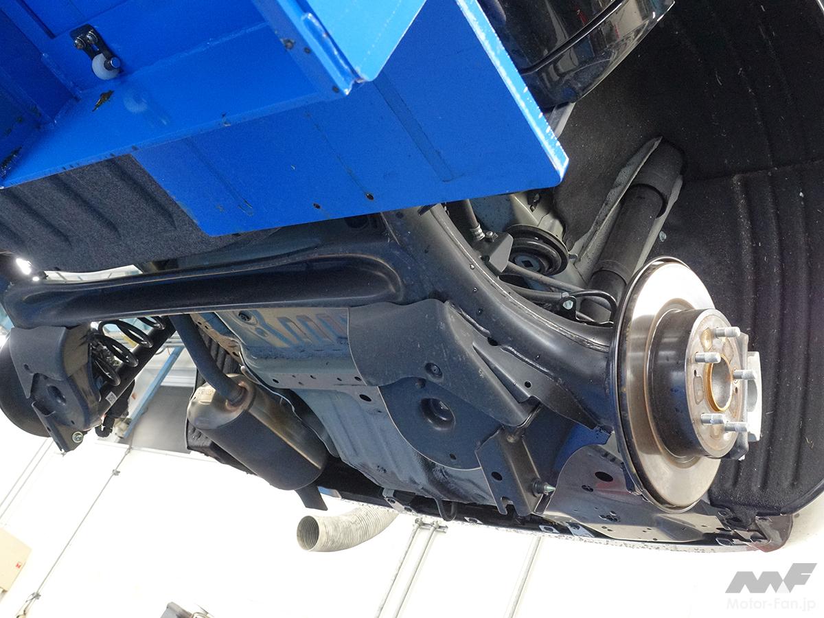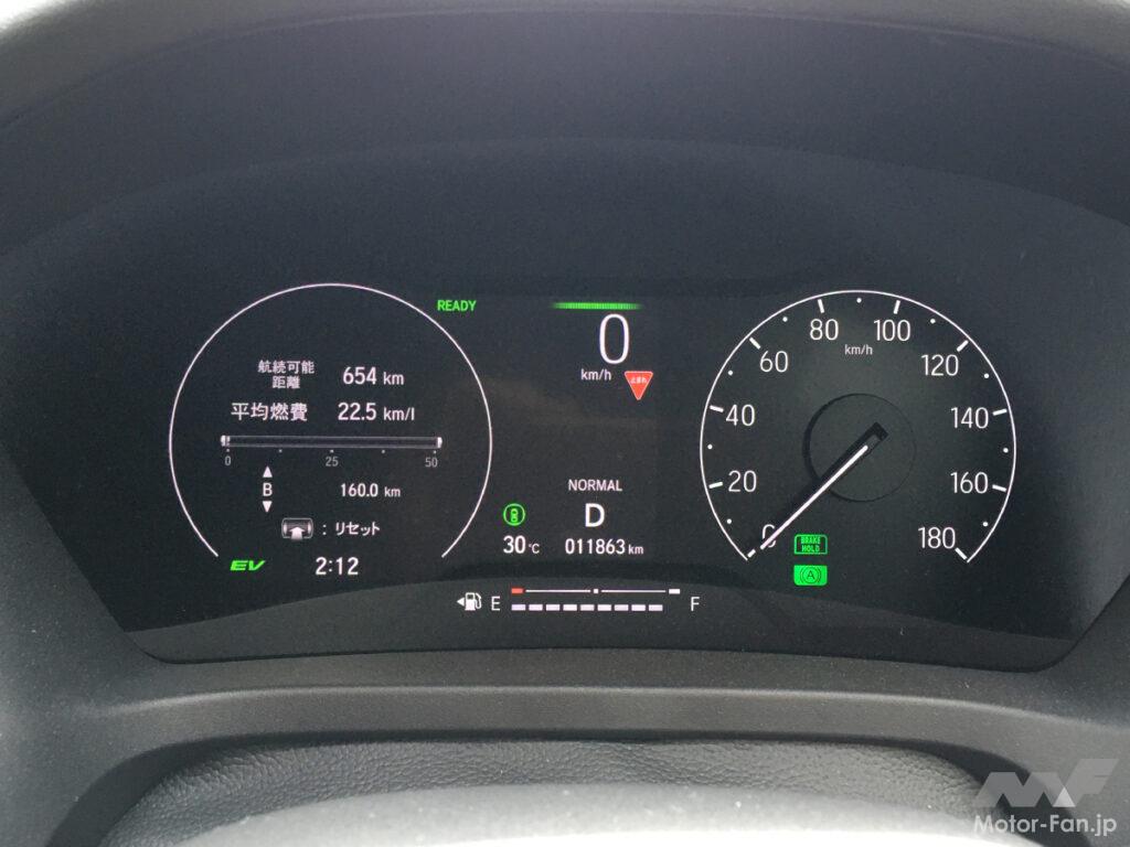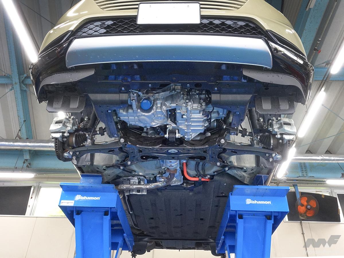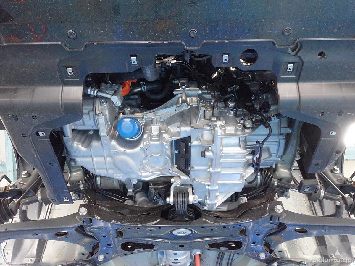 整備担当さんの仕事の邪魔にならぬよう前後サクッと手短に確認、撮影を行なう。まあ筆者が見たところで、いつも仕事で一緒になるモーターファン・イラストレーテッドの編集者やライター陣のように細かいところまで気が付くわけもないのだが、それでもフェンダー内タイヤハウスにはしっかりした遮音材を施しているのがよくわかった。遮音材は、所有していた先代ヴェゼルのそれより入念に施してあるようで、特にリヤで顕著に見てとれた。e:HEVとなった新型は先代ヴェゼル・ハイブリッドよりモーター駆動で走ることが多くなっているので、遮音にはことさら気を使ったことが窺われる。