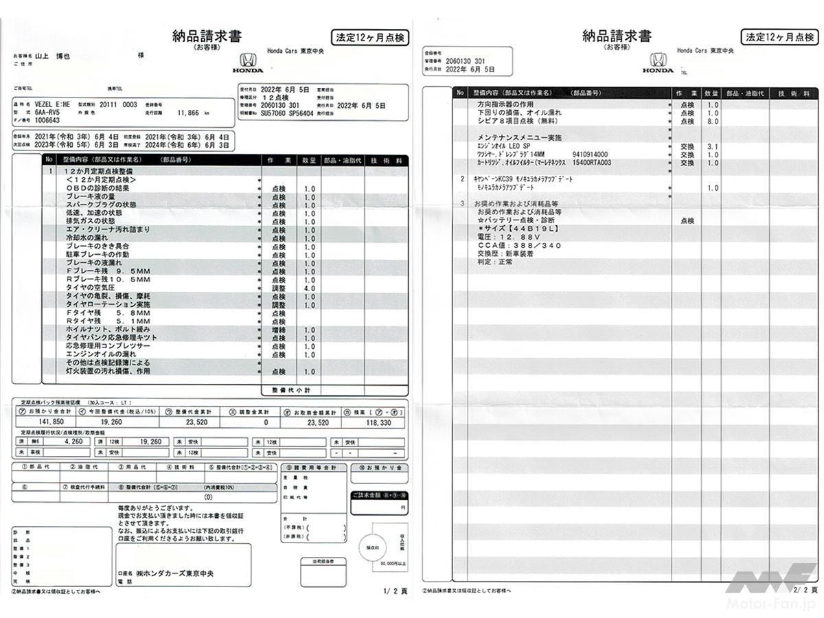 点検終了後、自宅に戻り整備記録の明細を確認した。タイヤの減り具合が気になっていたのだが、残り溝の深さはフロント5.1mm、リヤ5.8mm(点検で前後ローテーション)と記載されていた。新型ヴェゼルe:HEV Zのミシュラン・プライマシー4の新品時の溝の深さは8mmほどなのでフロントで6.5分山、リヤで7分山といったところ。現状の走行距離の伸び方を考えると最初の車検までもたず交換が必要になるだろう。延命処置という訳ではないが、冬はスタッドレス、もしくはオールシーズンに履き替えることも必要かなと考えている。