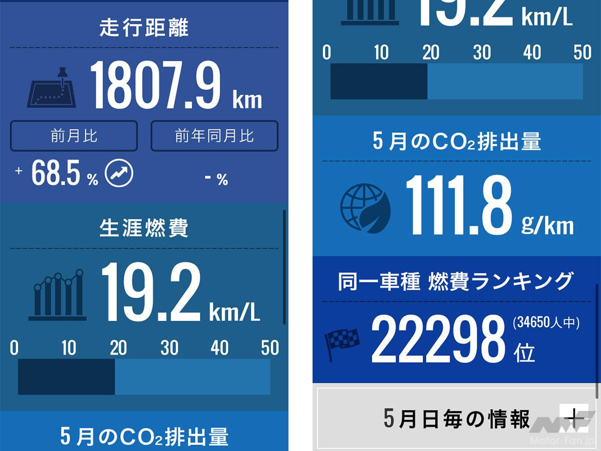 点検時の総走行距離は11,866km。平均にすると約1,000km/月で、そこそこ走ってる感じ。スマホアプリ「Honda Total Care」による5月末までの生涯燃費は19.2km/Lとなっていた。
