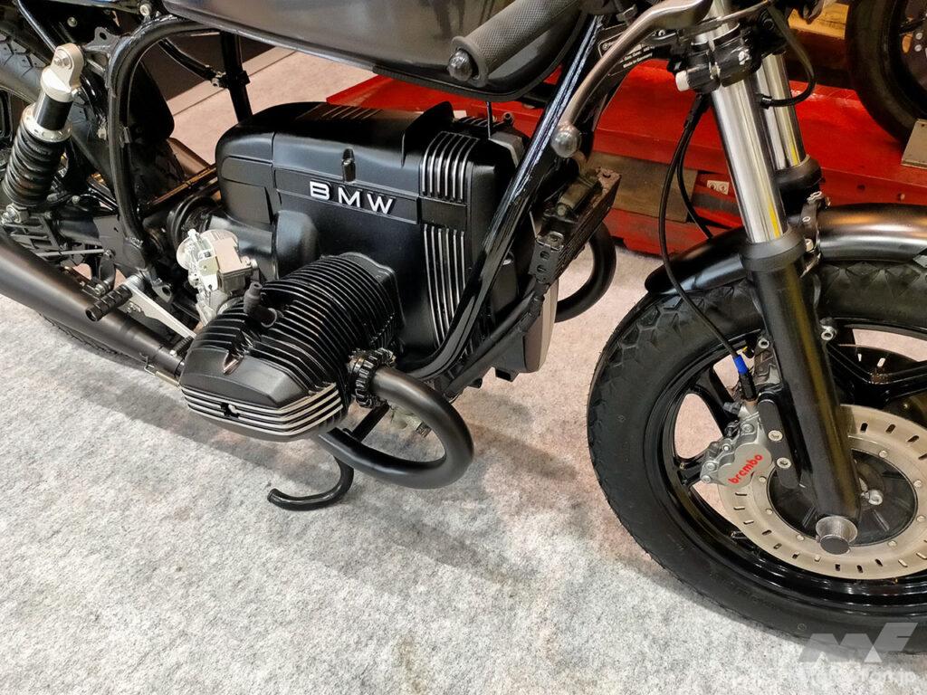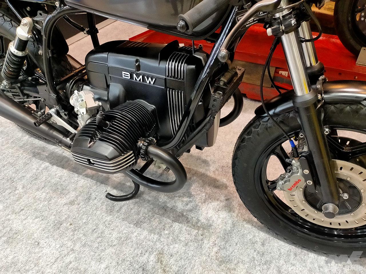 「ボクサーエンジン」とも呼ばれる、美しいBMW伝統の空冷4ストローク水平対向2気筒OHVエンジン。写真のカスタムには往年のレーシングキャブレター「ケイヒンCR」を組み合わせ。