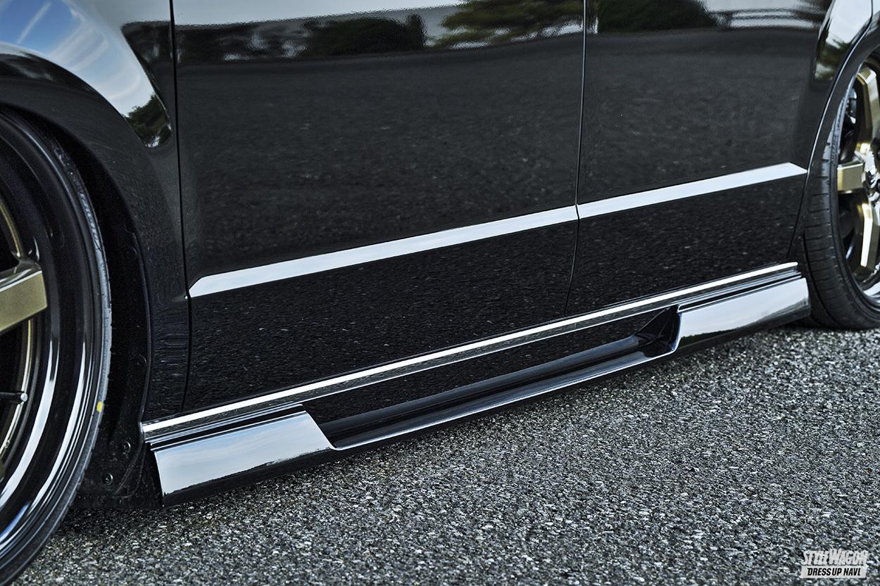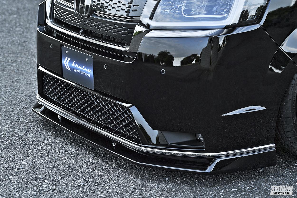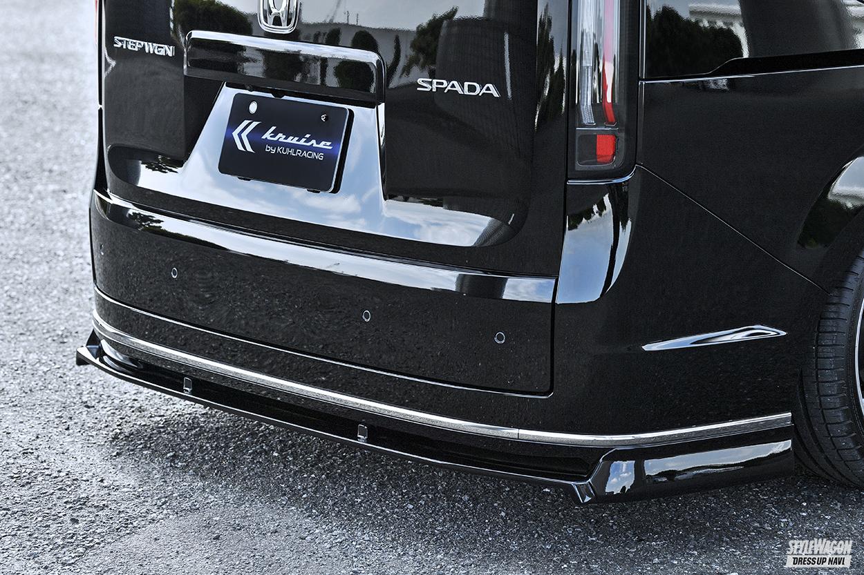 シリーズは、シンプル路線の『クルーズ』。だからフロント、サイド、リアとアイテムは揃うが(現時点でこの3点を開発・製品化)、前後はバンパー交換式でなくディフューザー。ベース車の形状を活かし、さり気なくイメチェンを図る方向性だ。だが、これまで『クルーズ』のデザインはフラップ調が一般的だったが、ステップワゴン用はボックス形状になっているのがユニーク。特にサイド、リアはカッチリした箱(ボックス)を設けた非フラップ的造形なのだ。それでも、『クルーズ』の流儀に沿って、純正車高でも似合うデザインを追求。エントリーユーザーでも日常の使い勝手で困ることのないサイズに収まっている(デモカーはエアサス搭載車で、ギリギリまで下げているが)。
