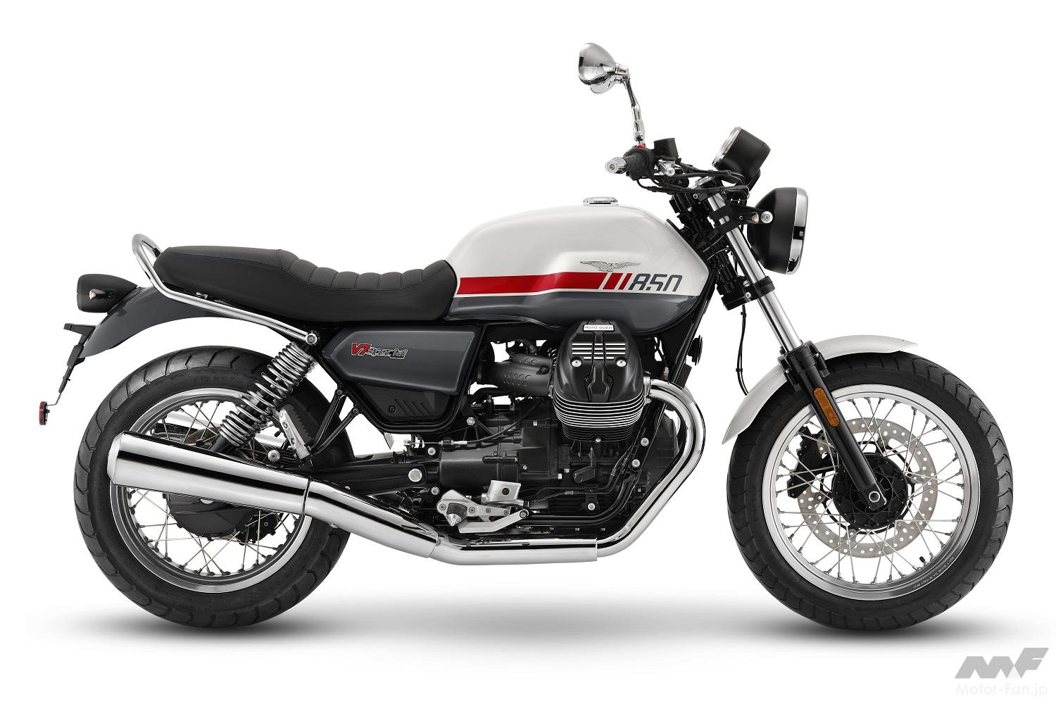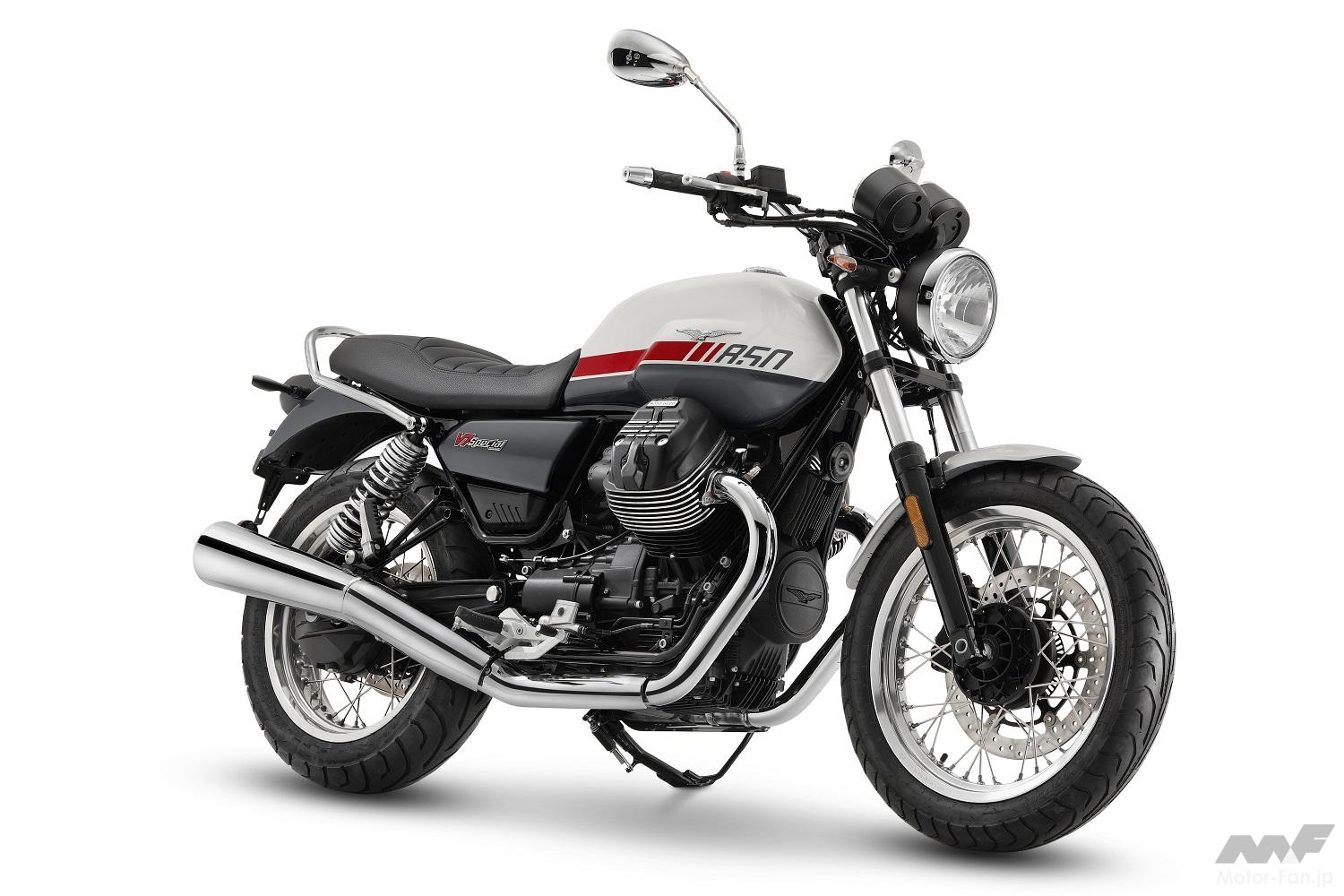 このバージョンはオリジナルモデルの精神に最も近いものだ。クラシックかつエレガントで多数のクロームパーツと鮮やかなグラフィックが特徴だ。モト・グッツィ V7スペシャルは、排気量を表した燃料タンクの特徴的なカラーストライプで新たな世界観を際立たせる。スポークホイールには光沢仕上げのリムとブラック塗装のハブを採用している。アナログのインストルメントパネルは2眼メーターを採用し、クロームメッキのパッセンジャーグラブレールが標準装備されている。ライトシステムはLEDターンシグナルとテールライトを採用し、ヘッドランプはクラシックなハロゲンバルブを採用している。V7 スペシャルでは冷却フィンを機械で切削加工を施したシリンダーや、クロームのエキゾーストパイプなど、クラシカルでエレガントなオリジナル性を強調するディテールが施されている。