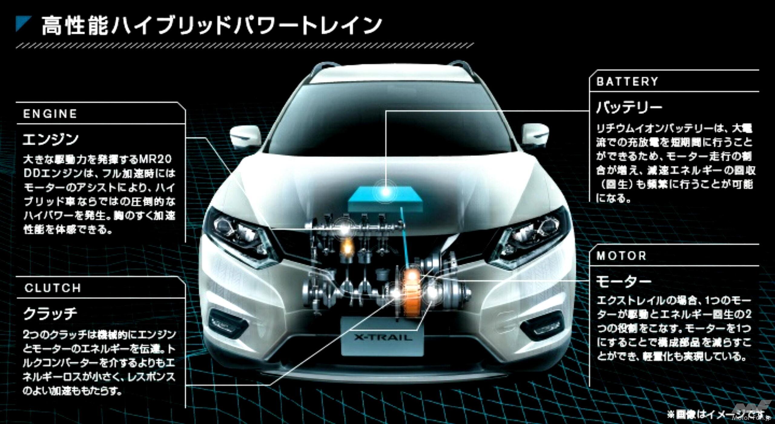 先代モデルのT32型には、日本ではMR20DD型2.0ℓガソリンエンジン搭載車と、2015年に追加投入された、それをベースにした1モーター2クラッチ・パラレル方式の独自のハイブリッドシステム『インテリジェント デュアル クラッチ コントロール』を用いたハイブリッド車があります。駆動方式は新型同様に2WD(FF)と4WDの選択が可能でした。